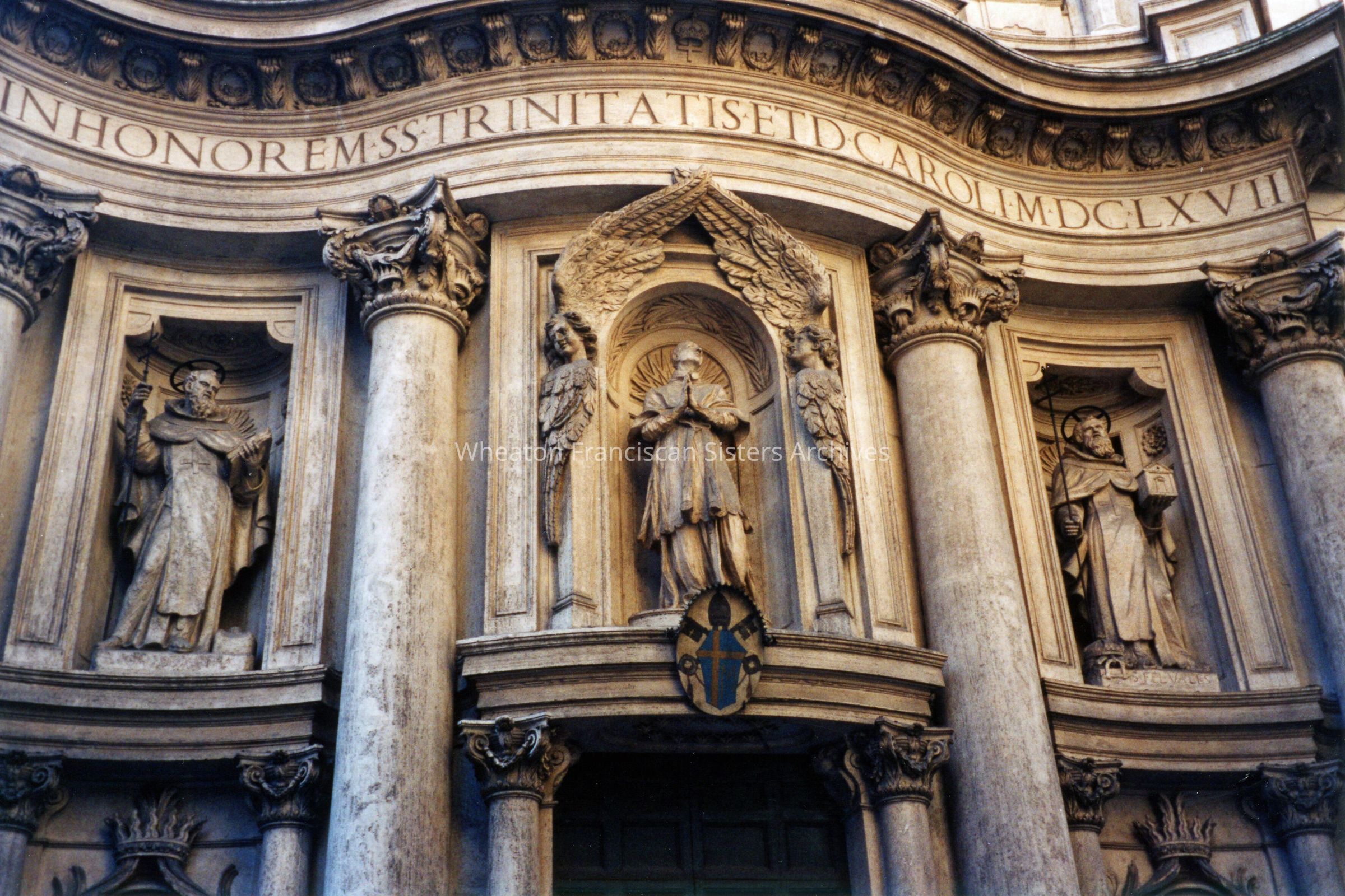 The entrance to San Carlo (Carlino) alle Quattro Fontane, a Roman Catholic church located in Rome, Italy. The church was designed by architect Francesco Borromini and was consecrated in 1646. After her arrival in Rome in 1881, Mother Clara Pfaender came here to pray.