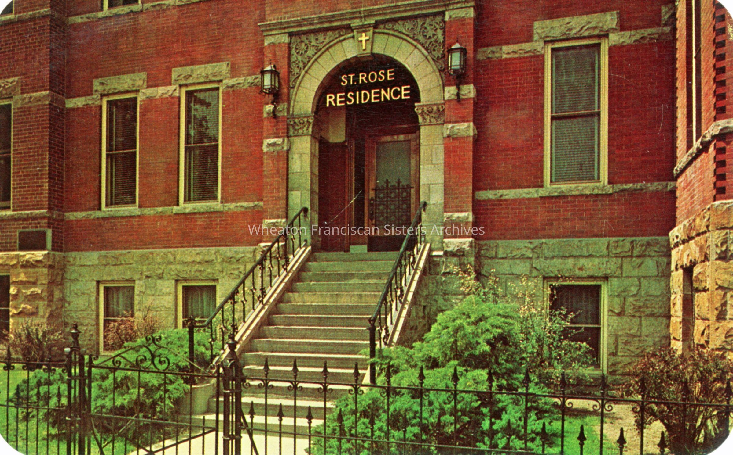 Postcard of the St. Rose Residence located at 952 10th Street in Denver, Colorado. A home for young working women, this image features the main entrance. At different times, this location was known as St. Clara's Convent, St. Rose's Convent, St. Rosa's Home and was also once the site of St. Clara's Orphanage.