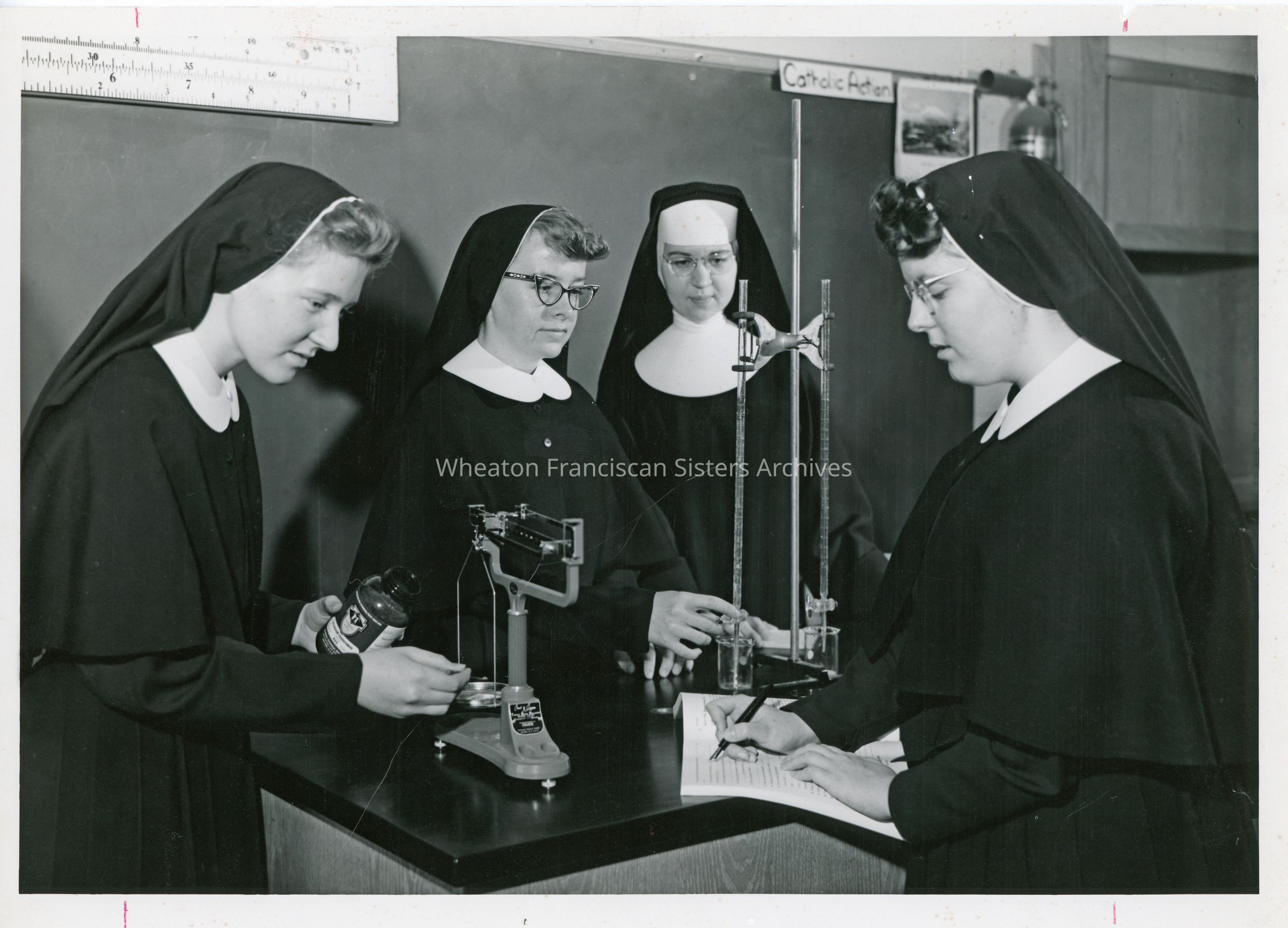 St. Francis High School located at 2130 West Roosevelt Road in Wheaton, Illinois. From left to right are Postulant Diane (Andre) DeWire, Postulant Mary Ellen (Joellen) McAleese, Sister Audrey (David/Audrey Marie) Rothweil and Postulant Carol (Ignatius/Carol Ann) Rottinghaus.