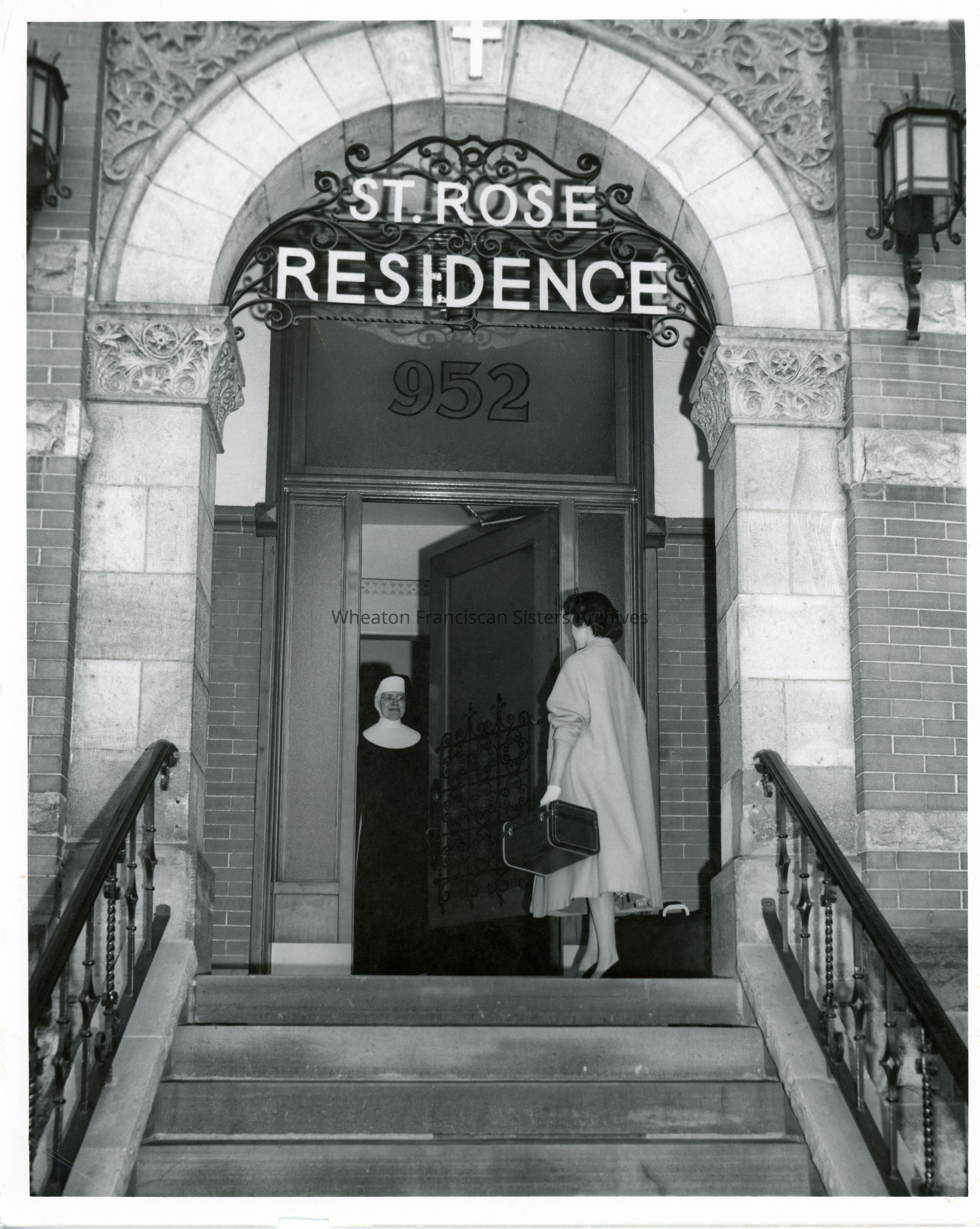 St. Rose Residence located at 952 10th Street in Denver, Colorado. A home for young working women, this image features Sister Marie (Elizabeth) Wertheimer welcoming an unidentified resident. At different times, this location was known as St. Clara's Convent, St. Rose's Convent, St. Rosa's Home and was once the site of St. Clara's Orphanage.