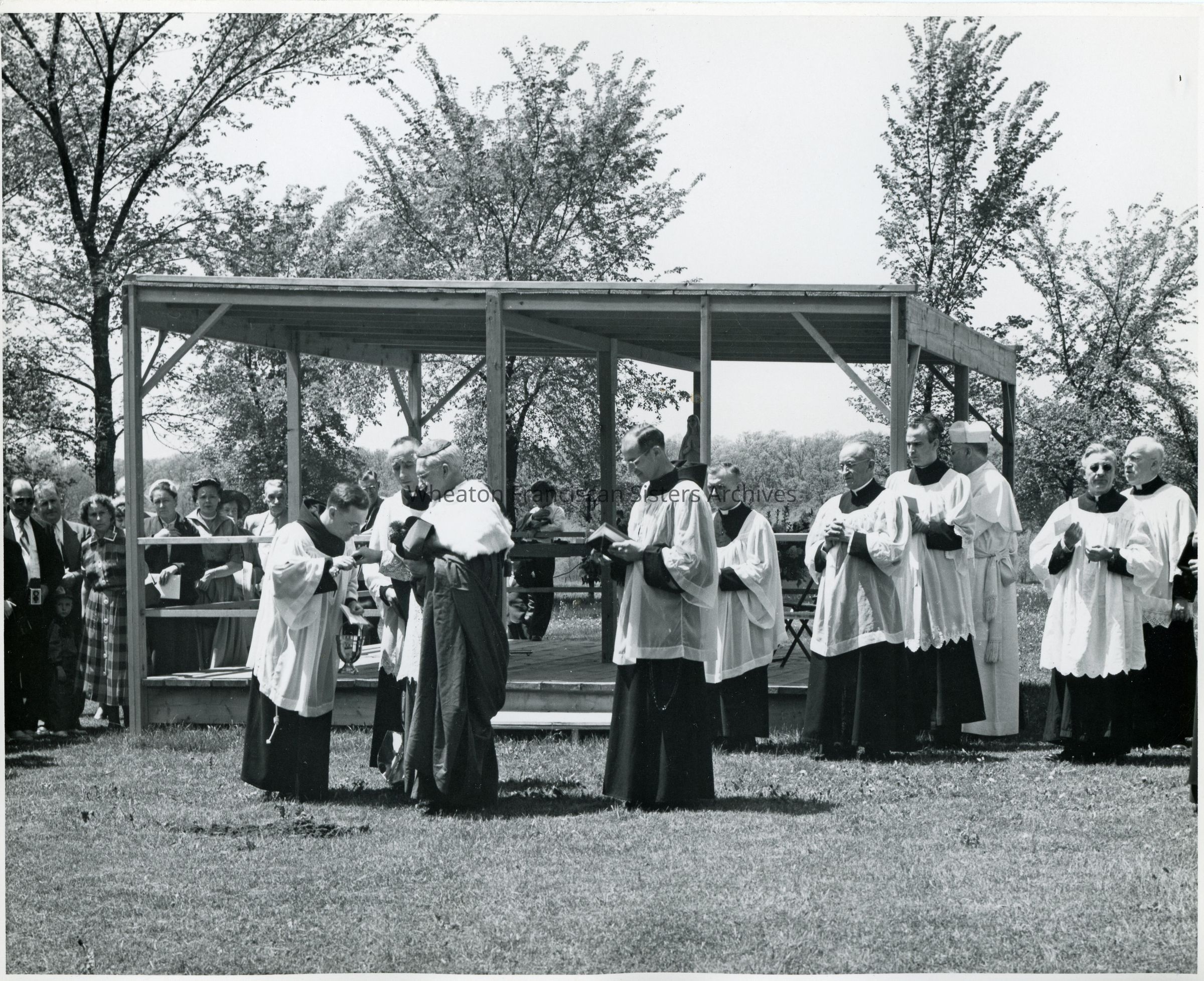 Groundbreaking ceremony for the Our Lady of Angels Motherhouse at 26W171 Roosevelt Road in Wheaton, Illinois. The shelter in the background held a large architectural model of the campus. Bishop Martin McNamara, Father Romeo Blanchette and Father Jasper are present.