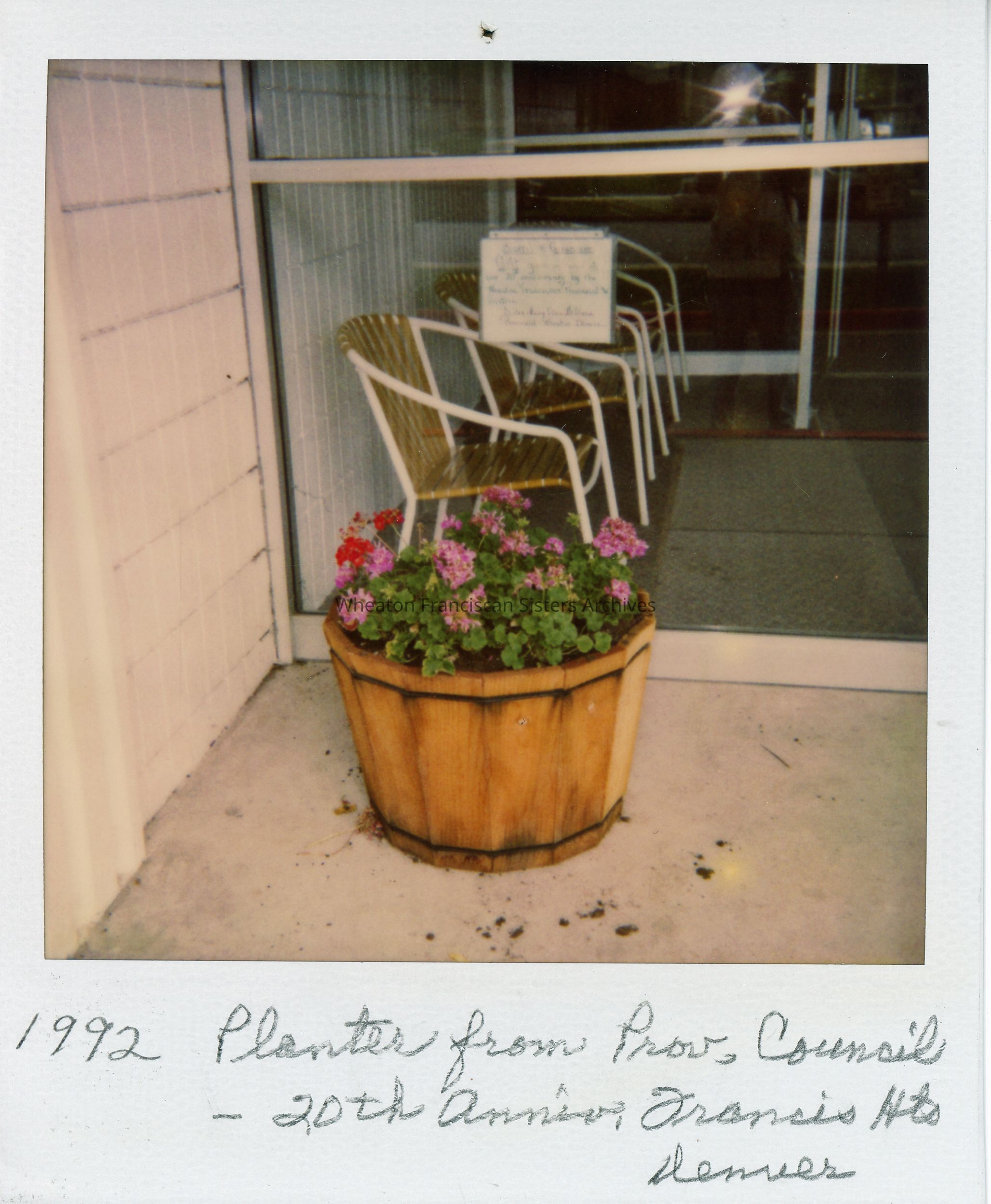 The twentieth anniversary of Francis Heights at 26th Avenue and Osceola Street in Denver, Colorado. This planter was a gift from the Provincial Council.