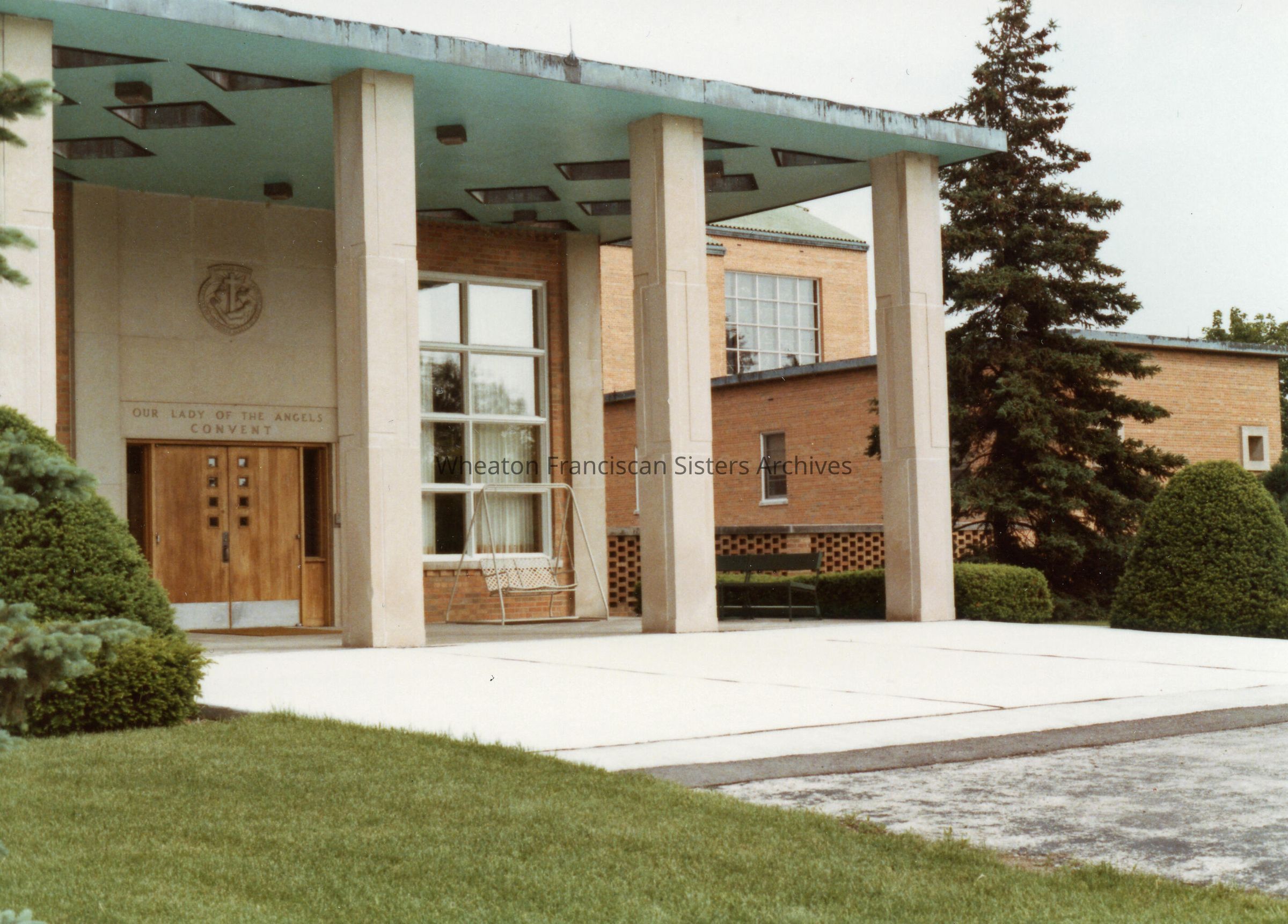 The Our Lady of Angels Motherhouse at 26W171 Roosevelt Road in Wheaton, Illinois. Looking north, the main entrance, later known as entrance seven, is pictured. The chapel and grotto are visible on the right.
