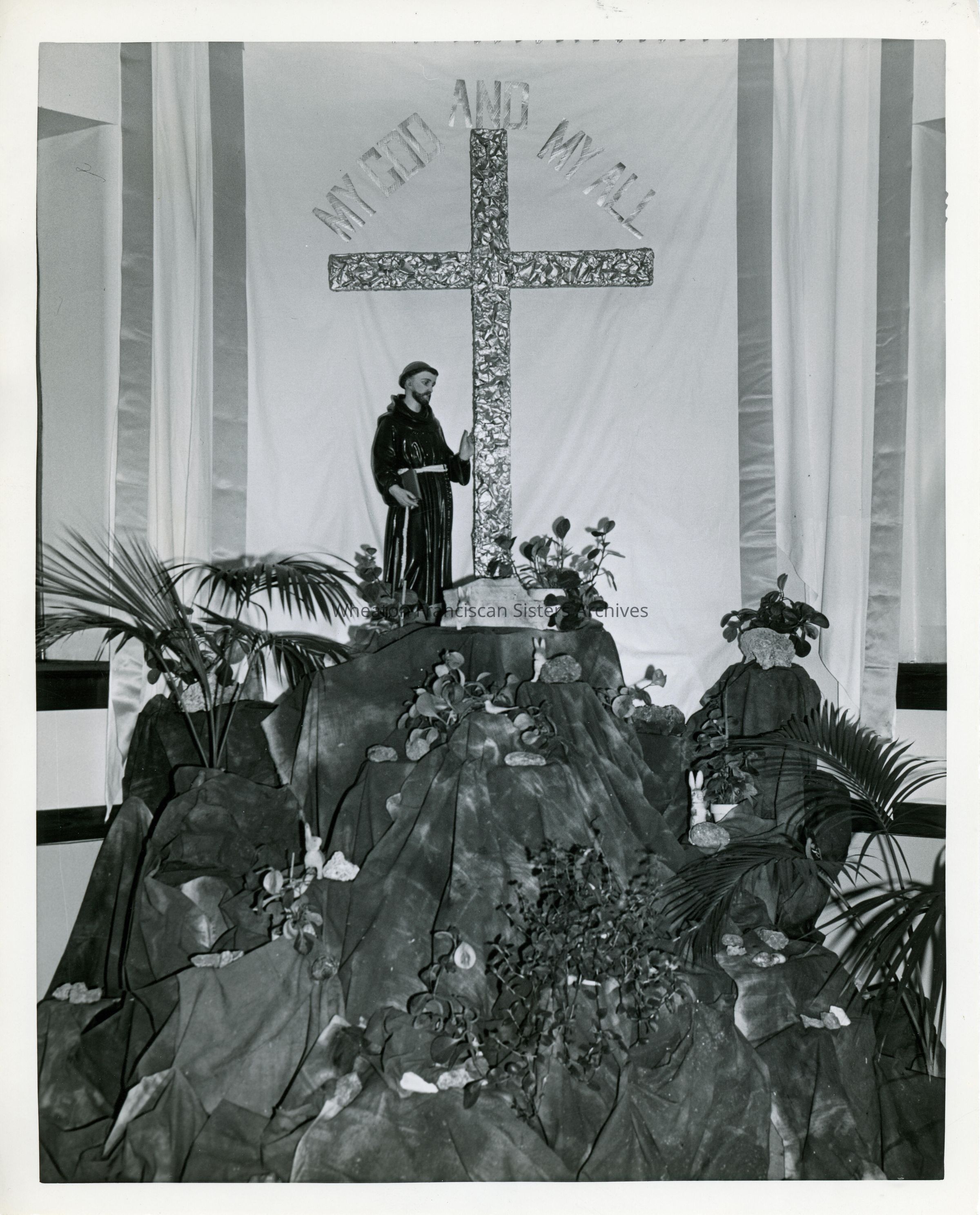 A display in St. Anthony’s Hospital located at 3520 Chippewa Street in St. Louis, Missouri. It features a statue of St. Francis and a banner that reads "My God and My All".