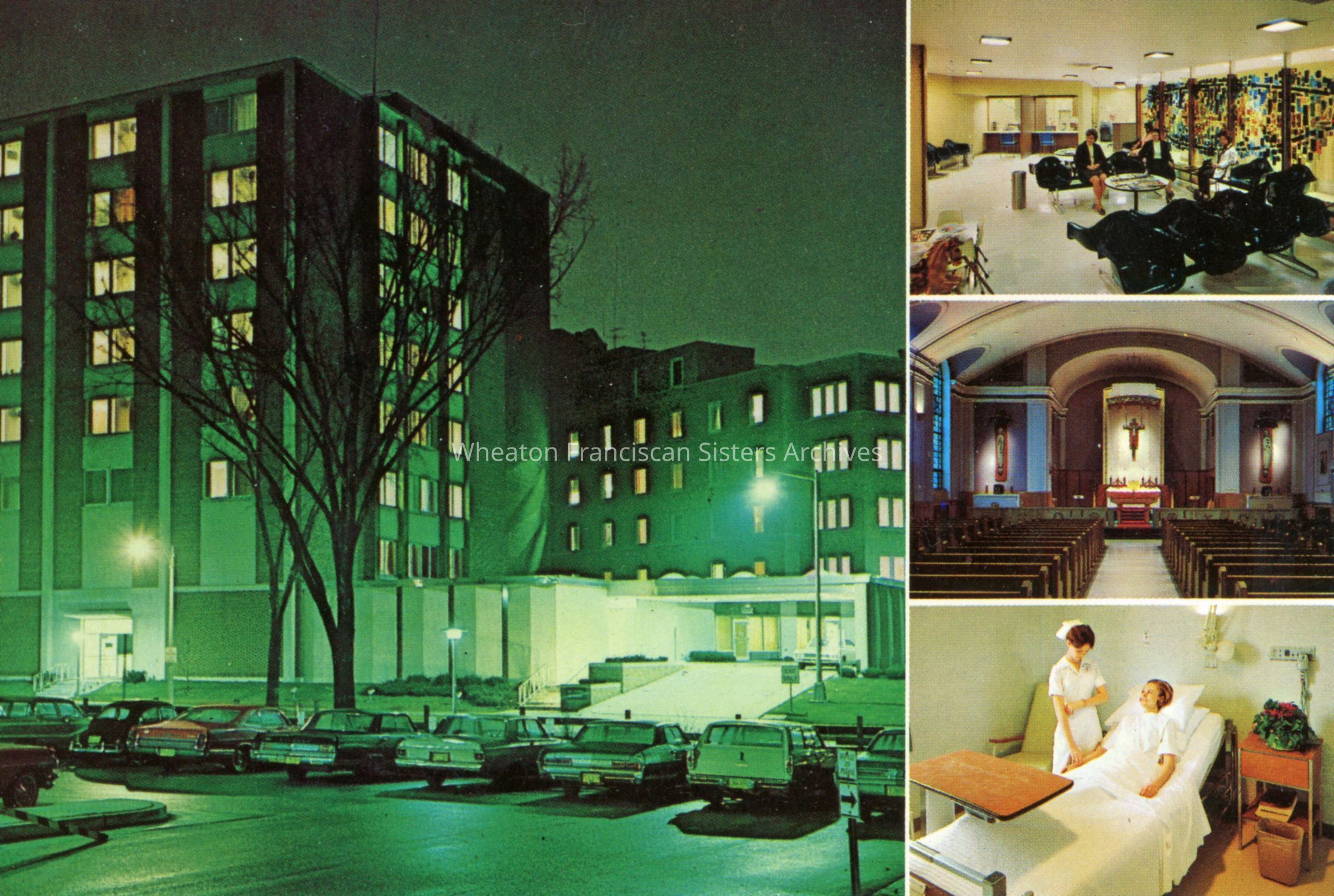 Postcard of St. Joseph's Hospital located at 5000 West Chambers Street in Milwaukee, Wisconsin. Images include the hospital's exterior, chapel, lobby and private room.