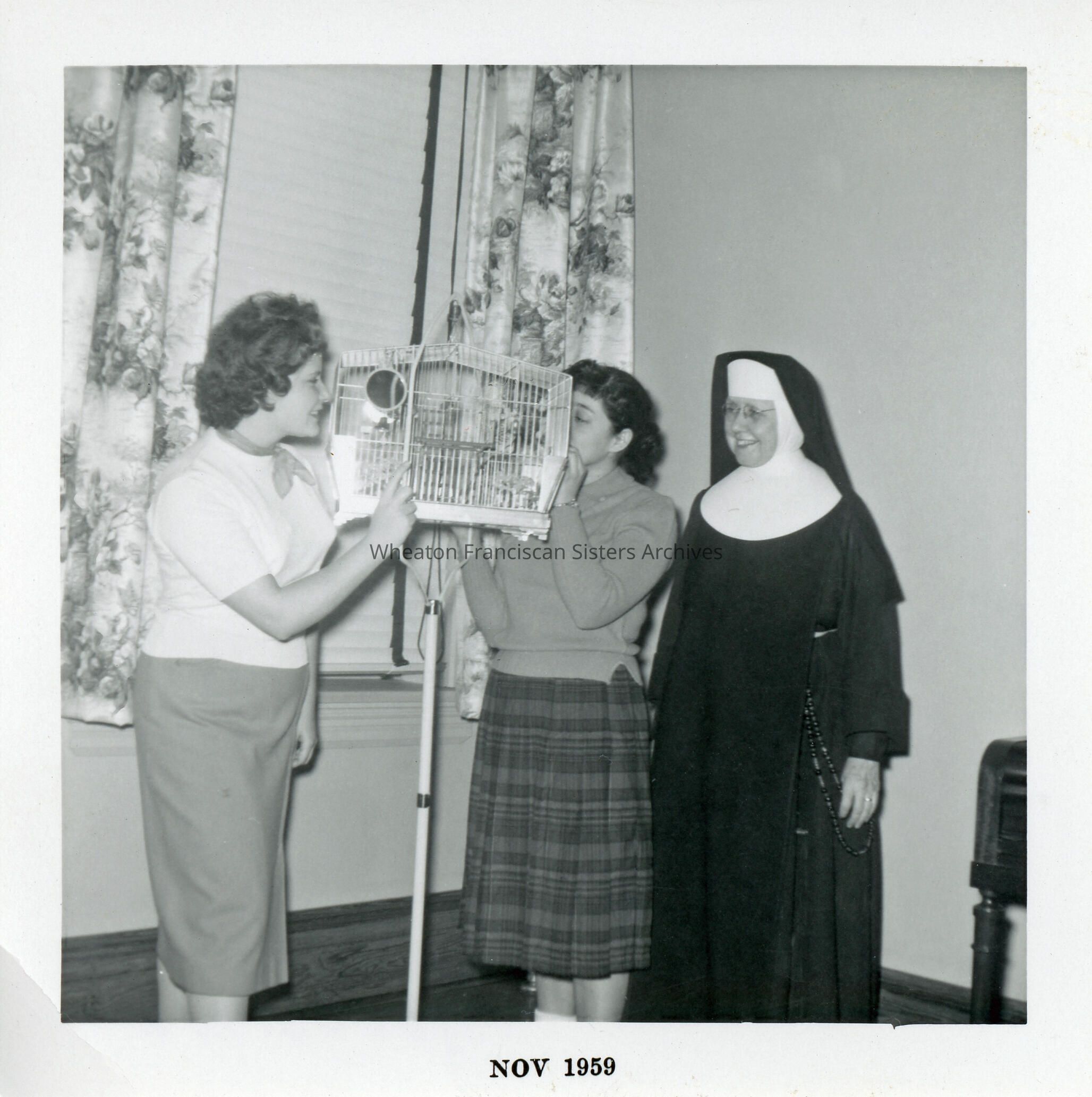 The House of Providence located at 1121 North Orleans Street in Chicago, Illinois. Sister Catherina (Miriam) Reinsbach is with two unidentified residents.