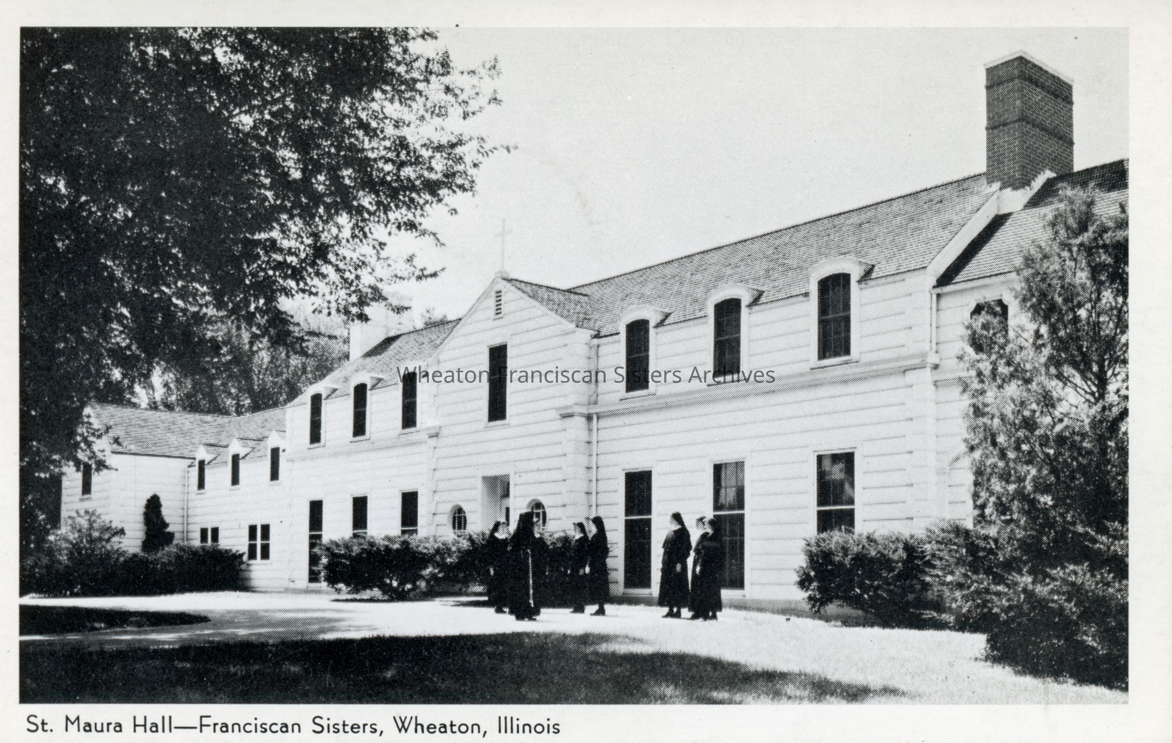 Postcard of the Motherhouse, also known as Maura Hall, in Wheaton, Illinois. Previously, this home was a wedding gift to Helen Hurley Ryan, daughter of Edward N. Hurley Sr.