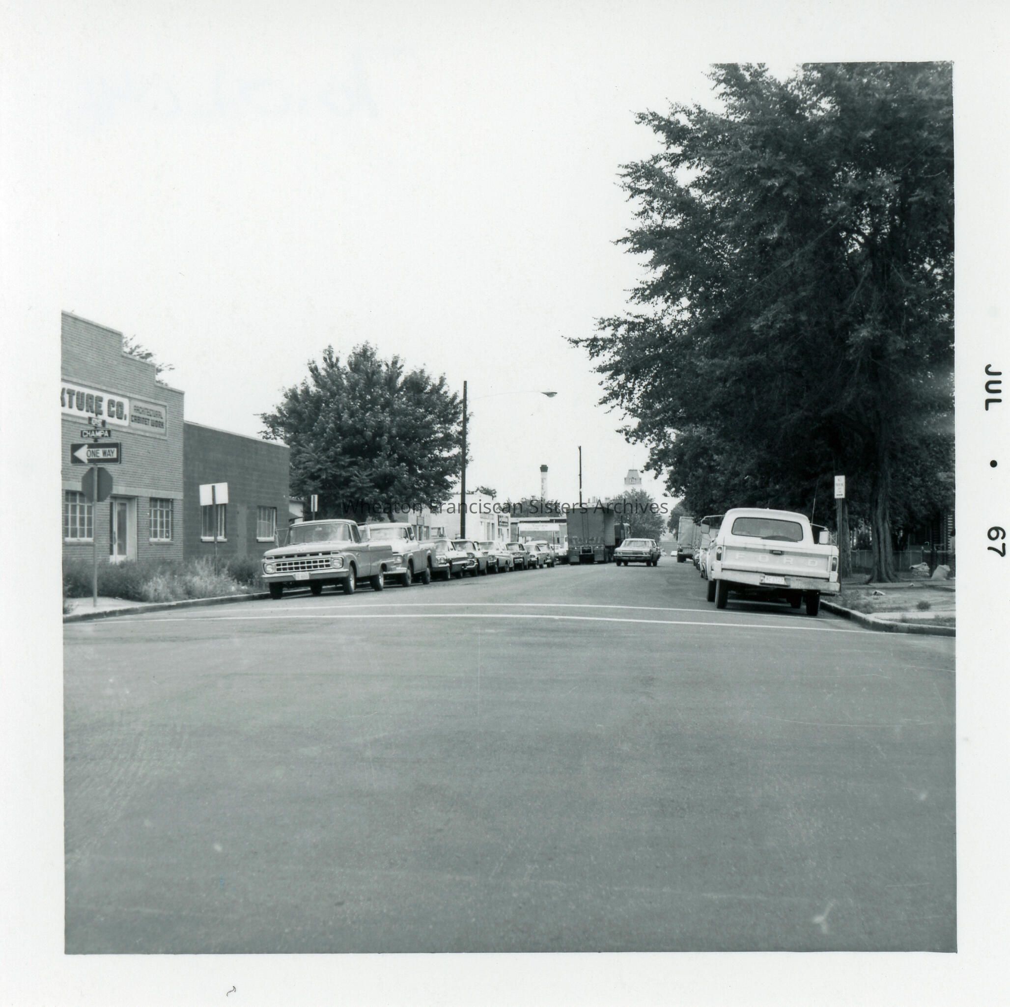 Property near the St. Rose Residence located at 952 10th Street in Denver, Colorado. A home for young working women, this image was taken around the time of its closure and features buildings along 10th Street. At different times, this location was known as St. Clara's Convent, St. Rose's Convent, St. Rosa's Home and was once the site of St. Clara's Orphanage.