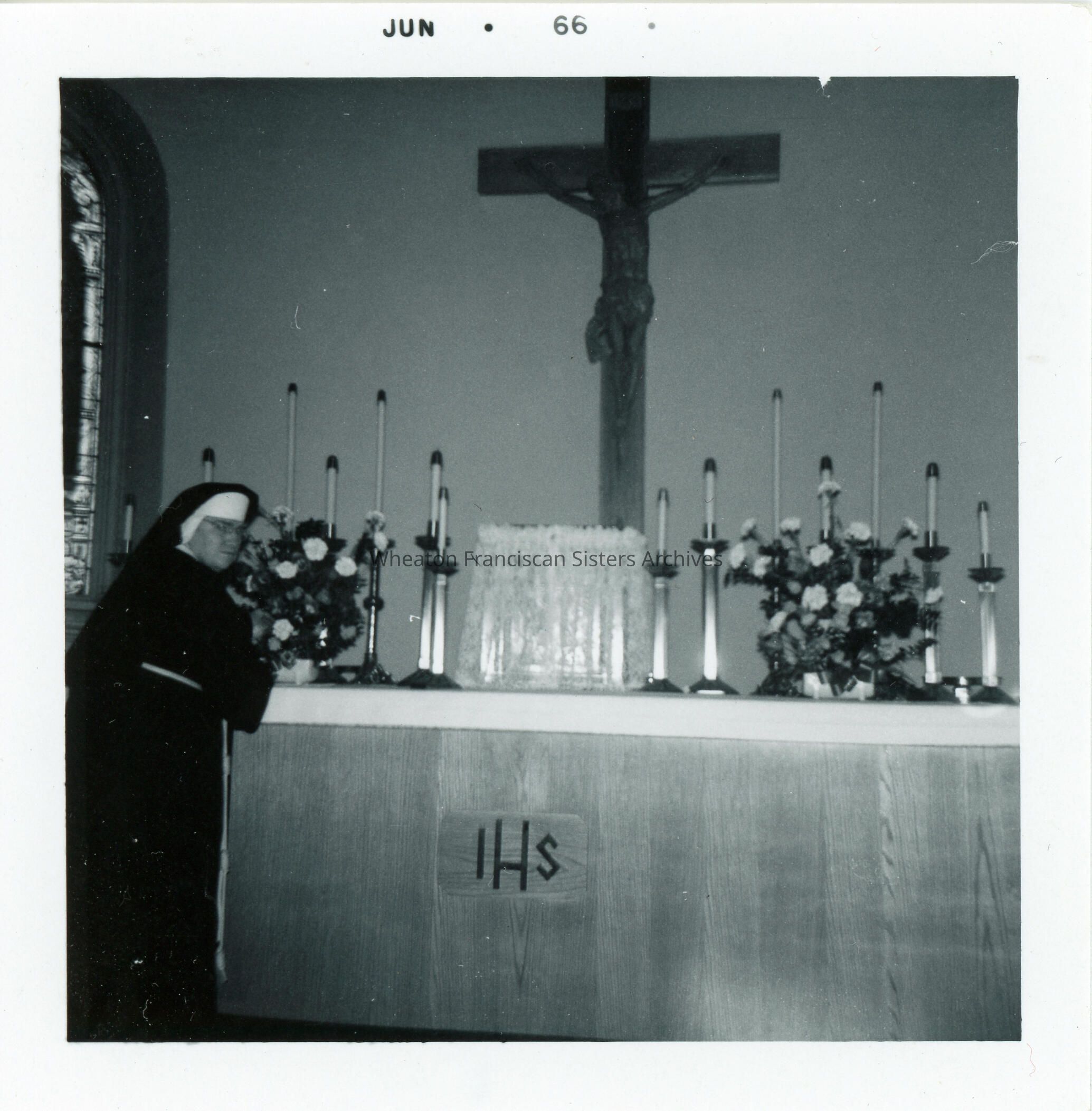 The chapel in St. Clara's Orphanage in Denver, Colorado. Sister Mary Jane Butler is present.