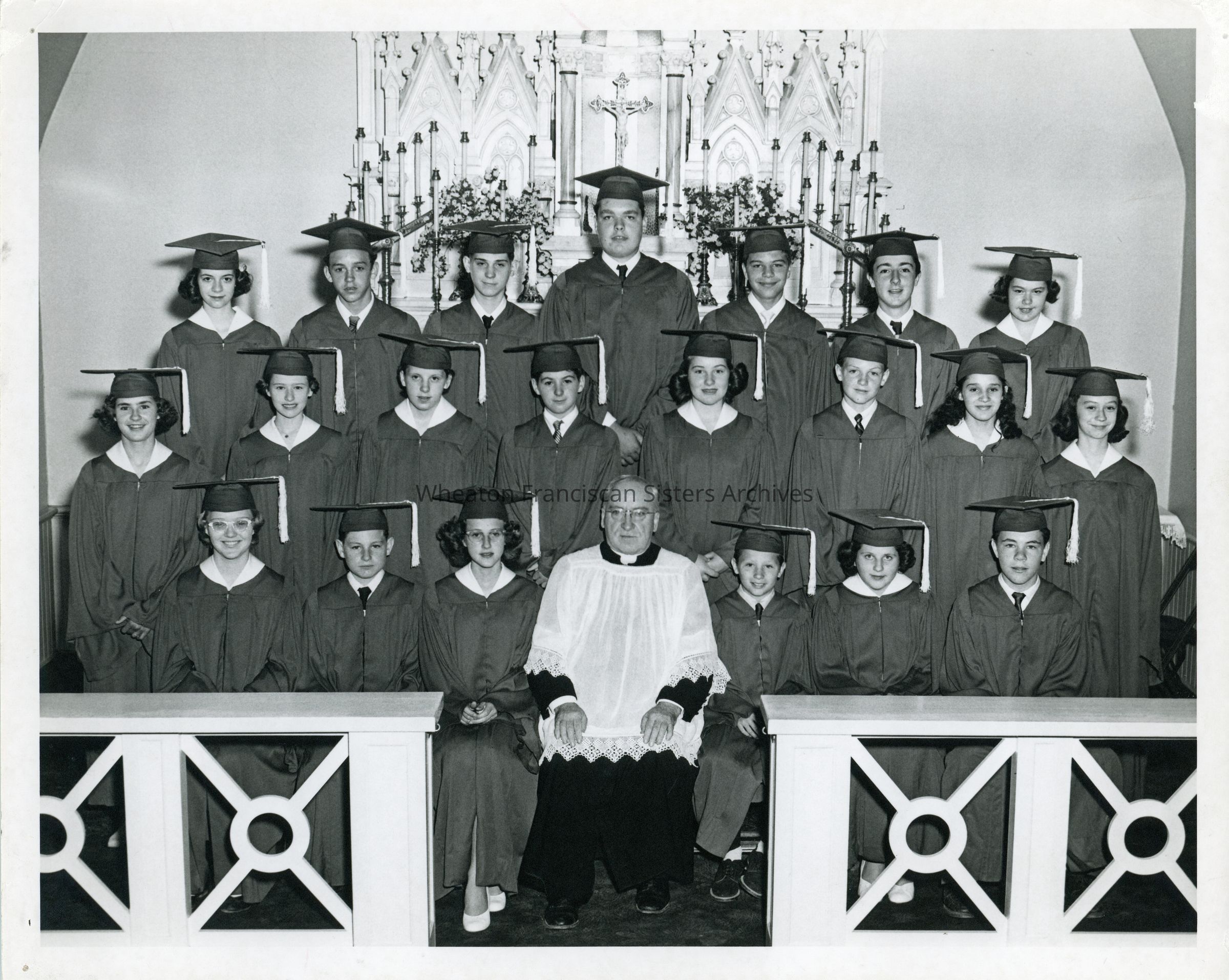 Transfiguration School graduating class. They are pictured in Transfiguration Church located at 217 South Church Street in Wauconda, Illinois. The graduates are seated near the altar with Father John H. Mulligan. Built around 1875, the white frame building later served as a meeting hall.
