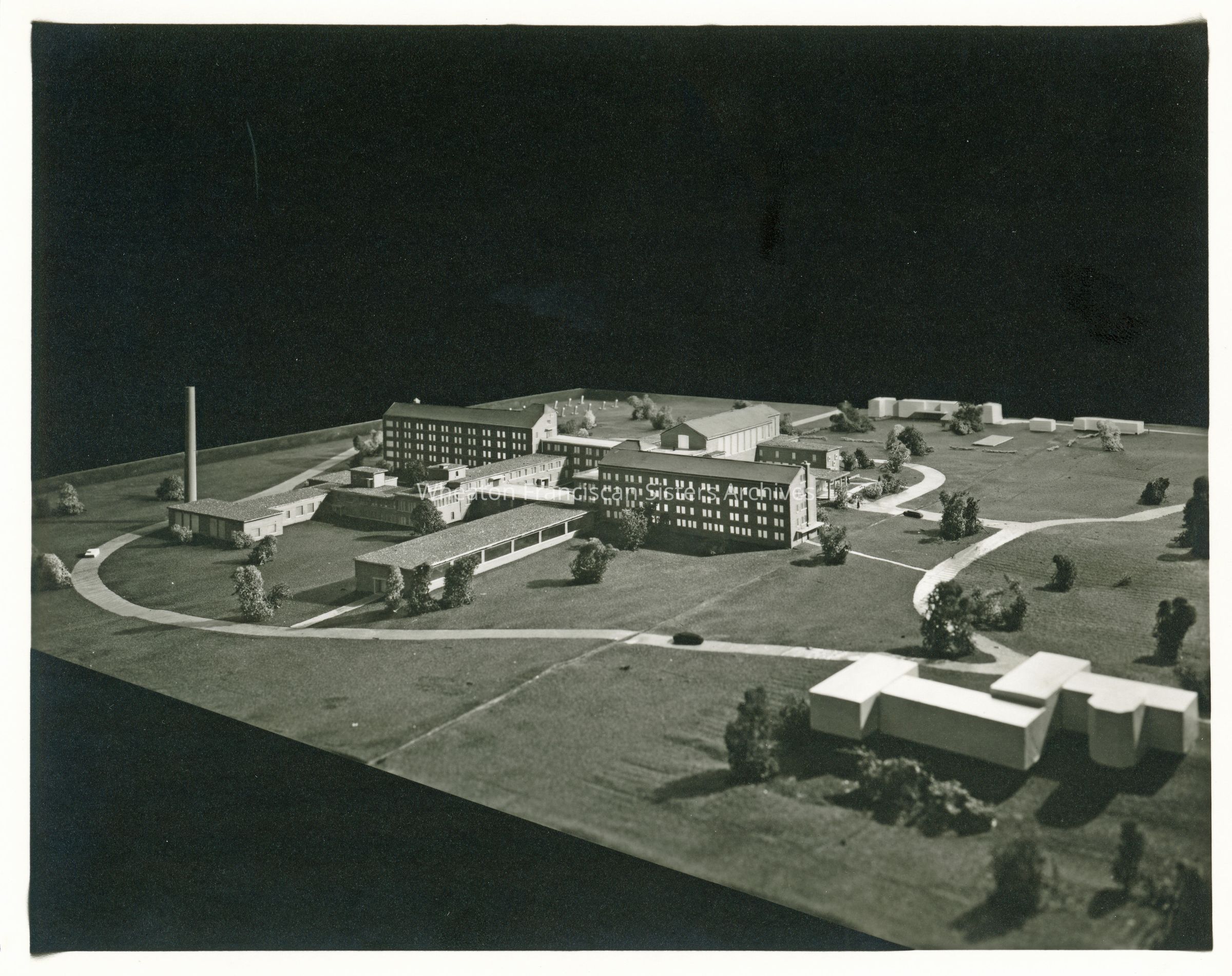 Architectural model of the Wheaton Franciscan Campus located at 26W171 Roosevelt Road in Wheaton, Illinois. It features the planned Our Lady of Angels Motherhouse and Novitiate.