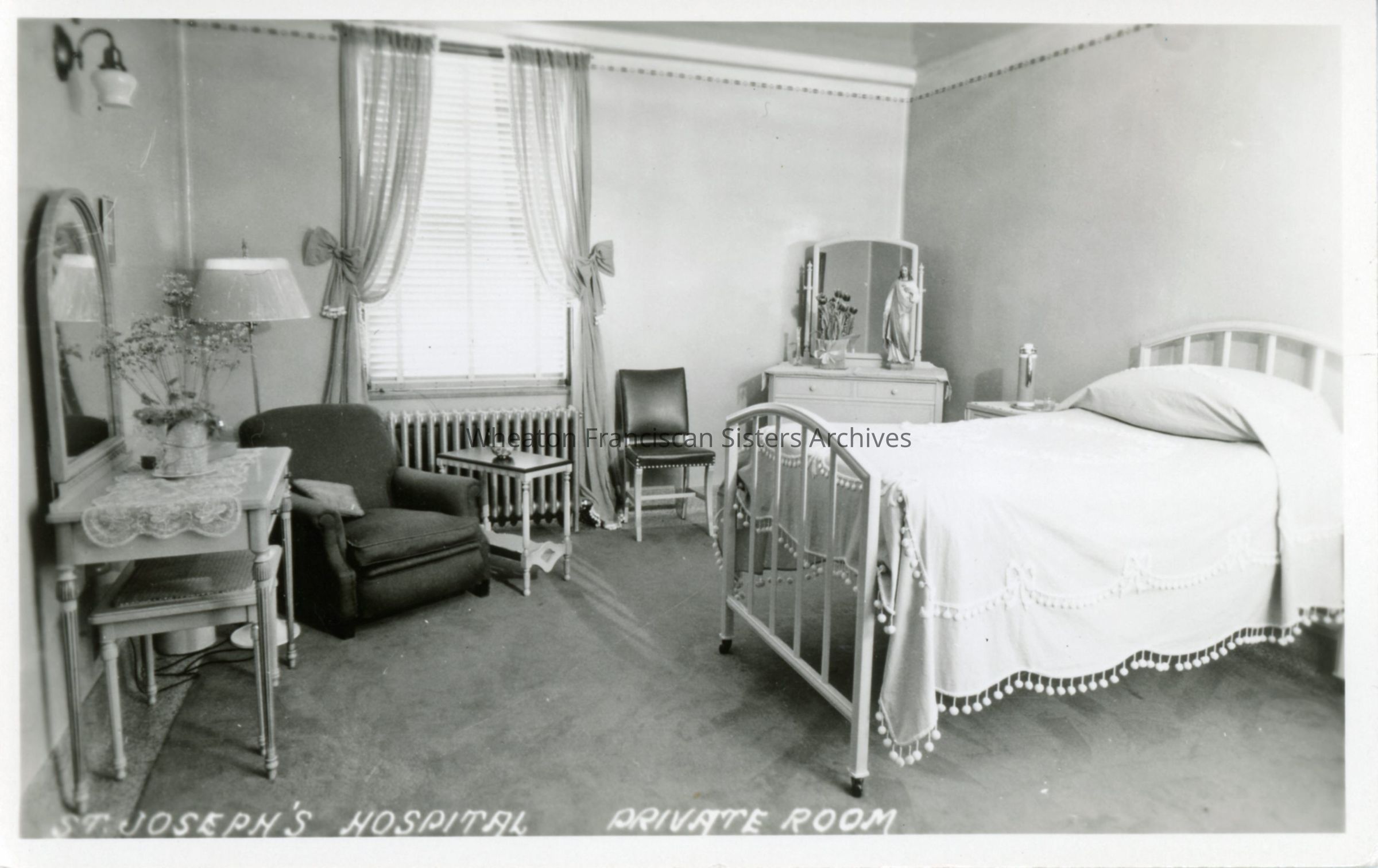Postcard of St. Joseph's Hospital located at 5000 West Chambers Street in Milwaukee, Wisconsin. This image features a private room.