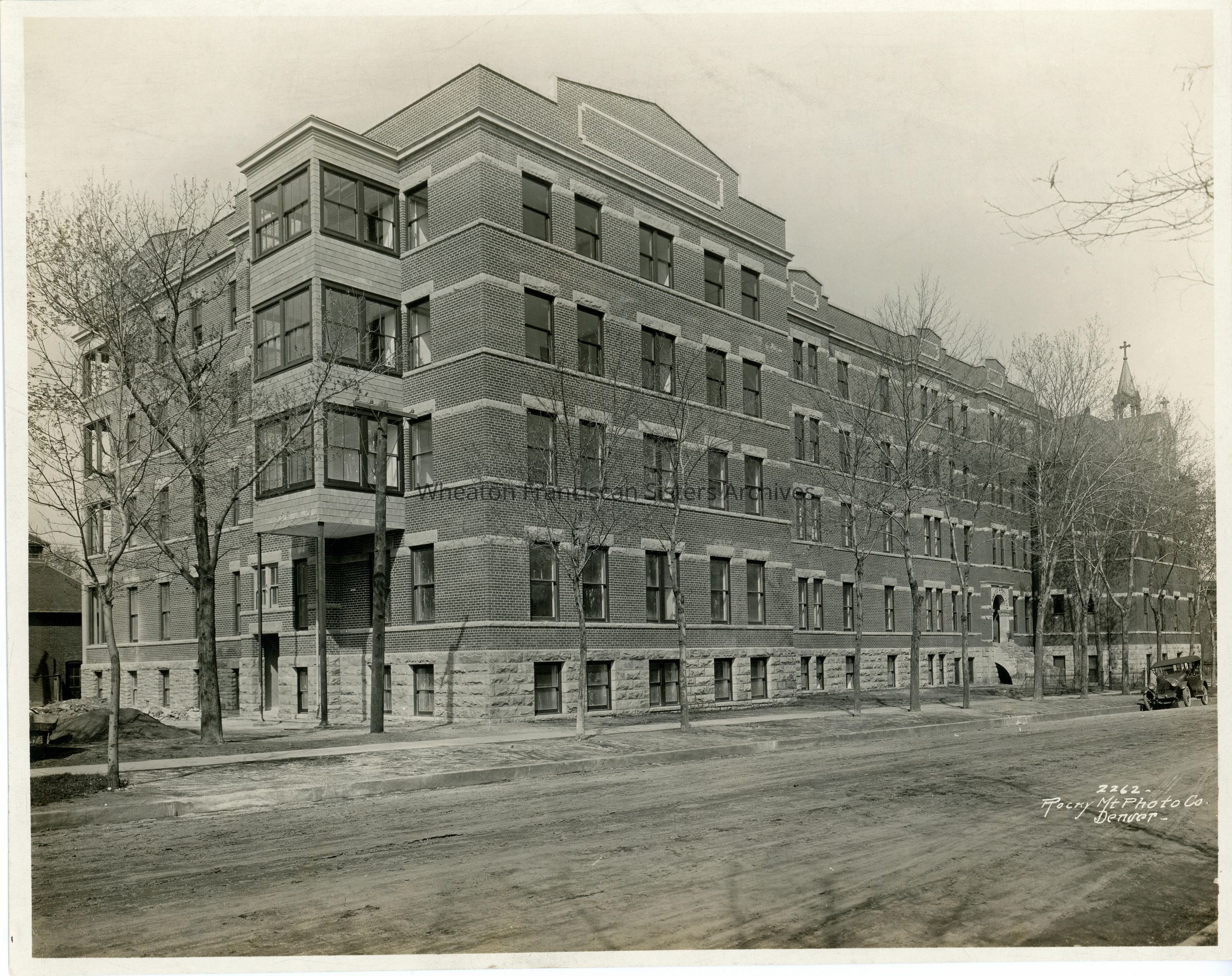 St. Rose Residence located at 952 10th Street in Denver, Colorado. A home for young working women, this image features a recently completed expansion. The older part of the structure is visible on the far right. At different times, this location was known as St. Clara's Convent, St. Rose's Convent, St. Rosa's Home and was once the site of St. Clara's Orphanage.