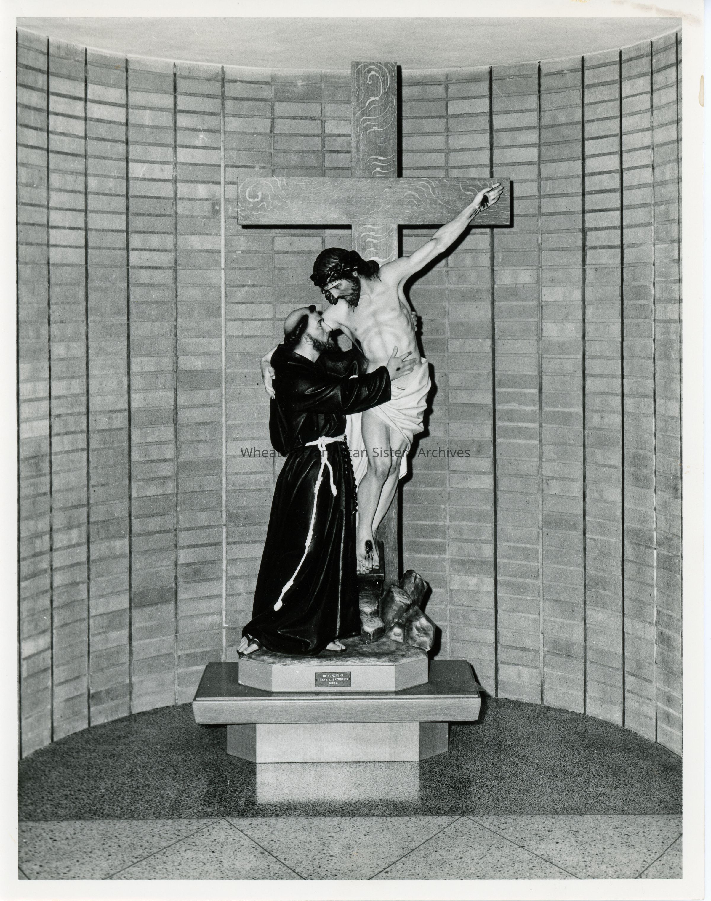 The Our Lady of Angels Motherhouse at 26W171 Roosevelt Road in Wheaton, Illinois. This image features a statue of St. Francis and Jesus located at the end of the front hall, just past the main entrance. At the bottom of the statue is a plaque that reads "In Memory of Frank and Catherine Micka".