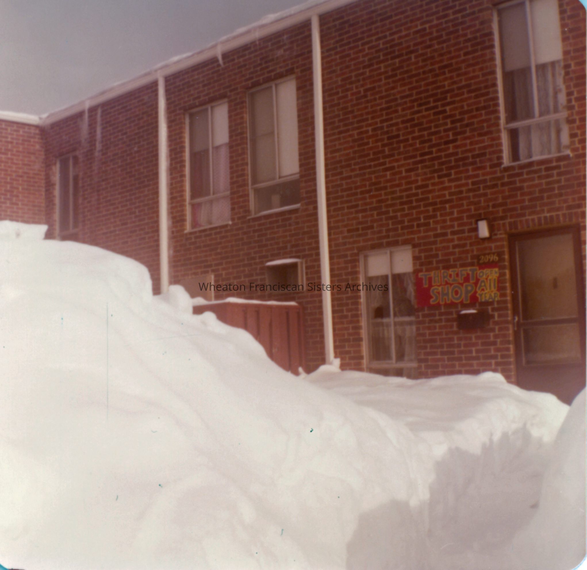 Marian Park in Wheaton, Illinois. A sign near the door says "Thrift Shop Open All Year".