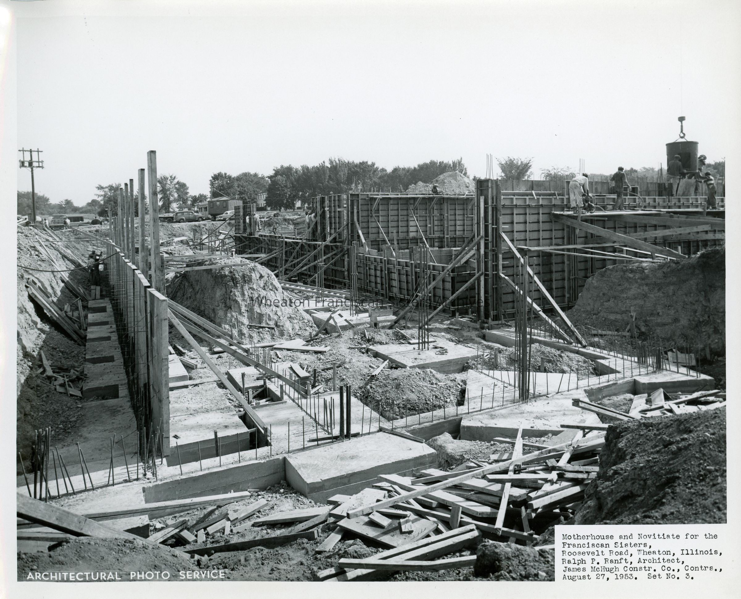 Construction of the Our Lady of Angels Motherhouse and Novitiate at 26W171 Roosevelt Road in Wheaton, Illinois. This image looks north across the foundation. In the distance, Maura Hall, then being used as the motherhouse, is just visible. The photo lists Ralph P. Ranft as the architect and James McHugh Construction as the contractor.