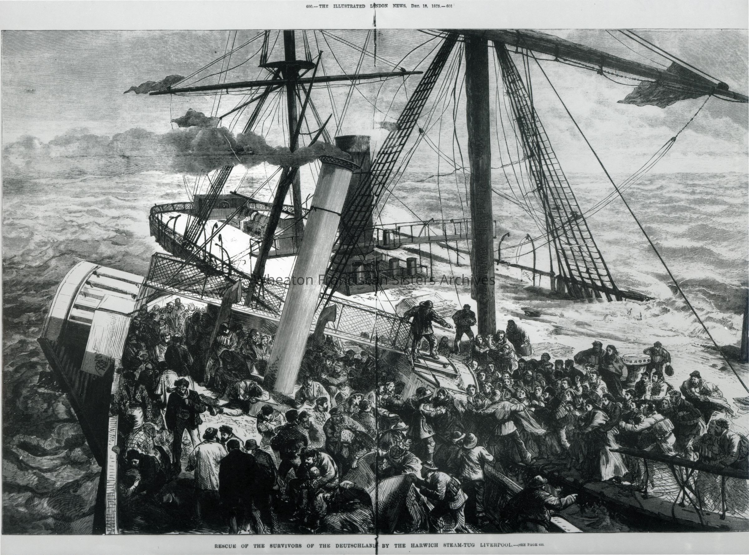 Plate from the Illustrated London News. It shows survivors from the S.S. Deutschland being rescued by the steam-tug Liverpool on December 7th, 1875. Five Franciscan Sisters perished in the wreck, however the body of Sister Henrica (Catherine) Fassbender was never recovered. The four other Sisters who lost their lives are Sister Barbara (Thekla) Hültenschmidt, Sister Brigitta (Elisabeth) Damhorst, Sister Norberta (Johanna) Reinkober and Sister Aurea (Josepha) Badziura. The women were traveling from the motherhouse in Salzkotten, Germany to St. Louis to lead the new American mission.Context