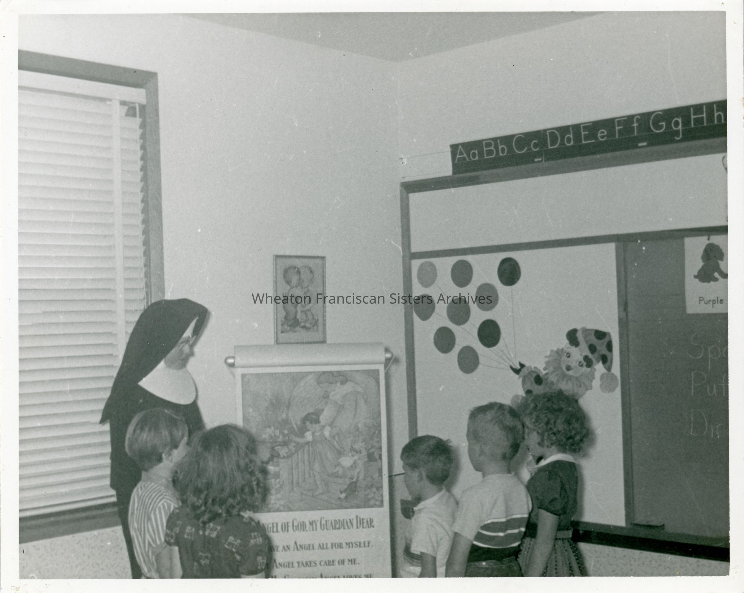 St. Joseph's School in Raymond, Iowa. This image features Sister Theresa (Pauline) Langfield teaching first and second grade.