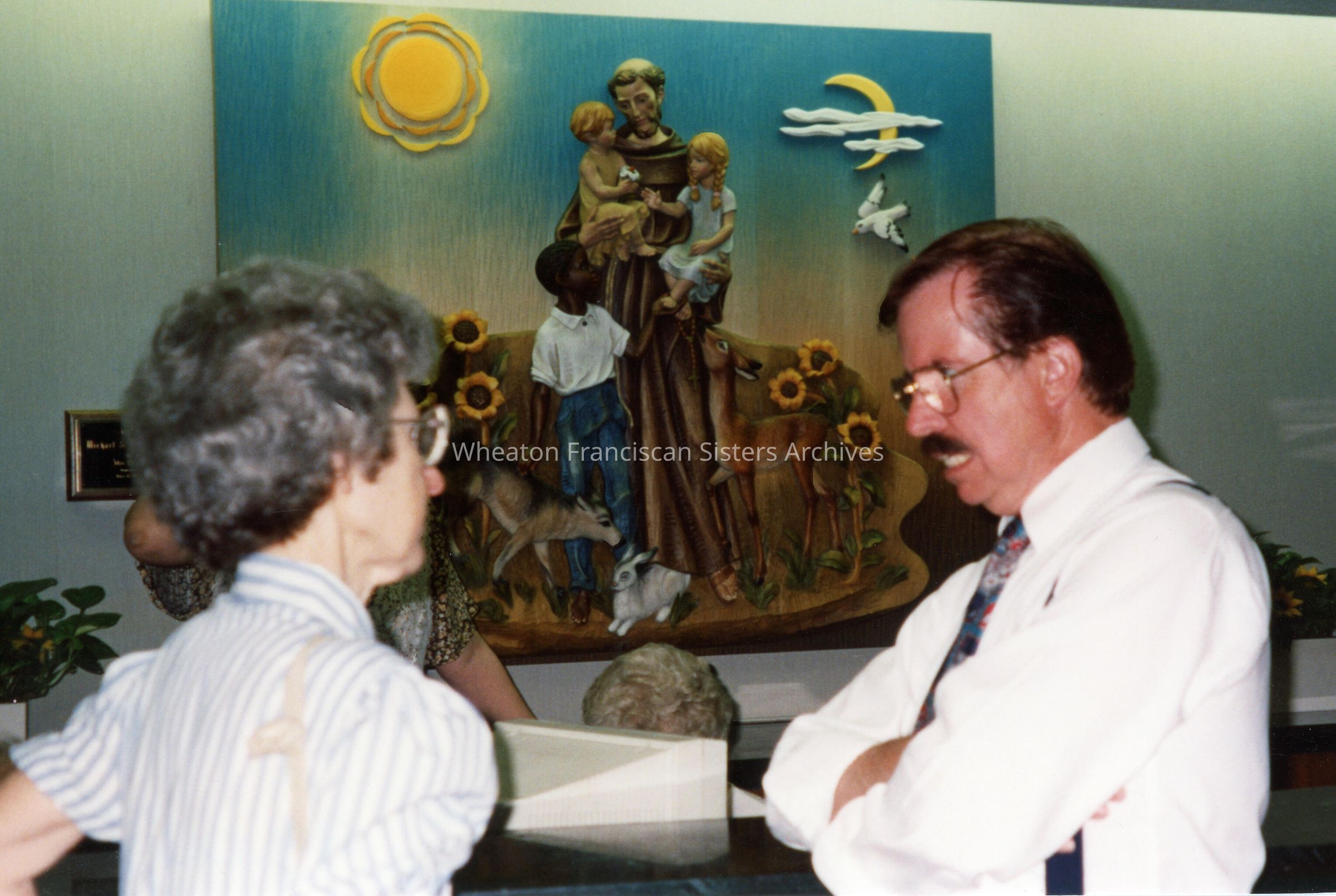 Oak Park Hospital located at 520 South Maple Avenue in Oak Park, Illinois. This image features the presentation and blessing of a St. Francis wood carving. Pictured are Sister Clara (Ursula) Siebert and Brother Michael May.