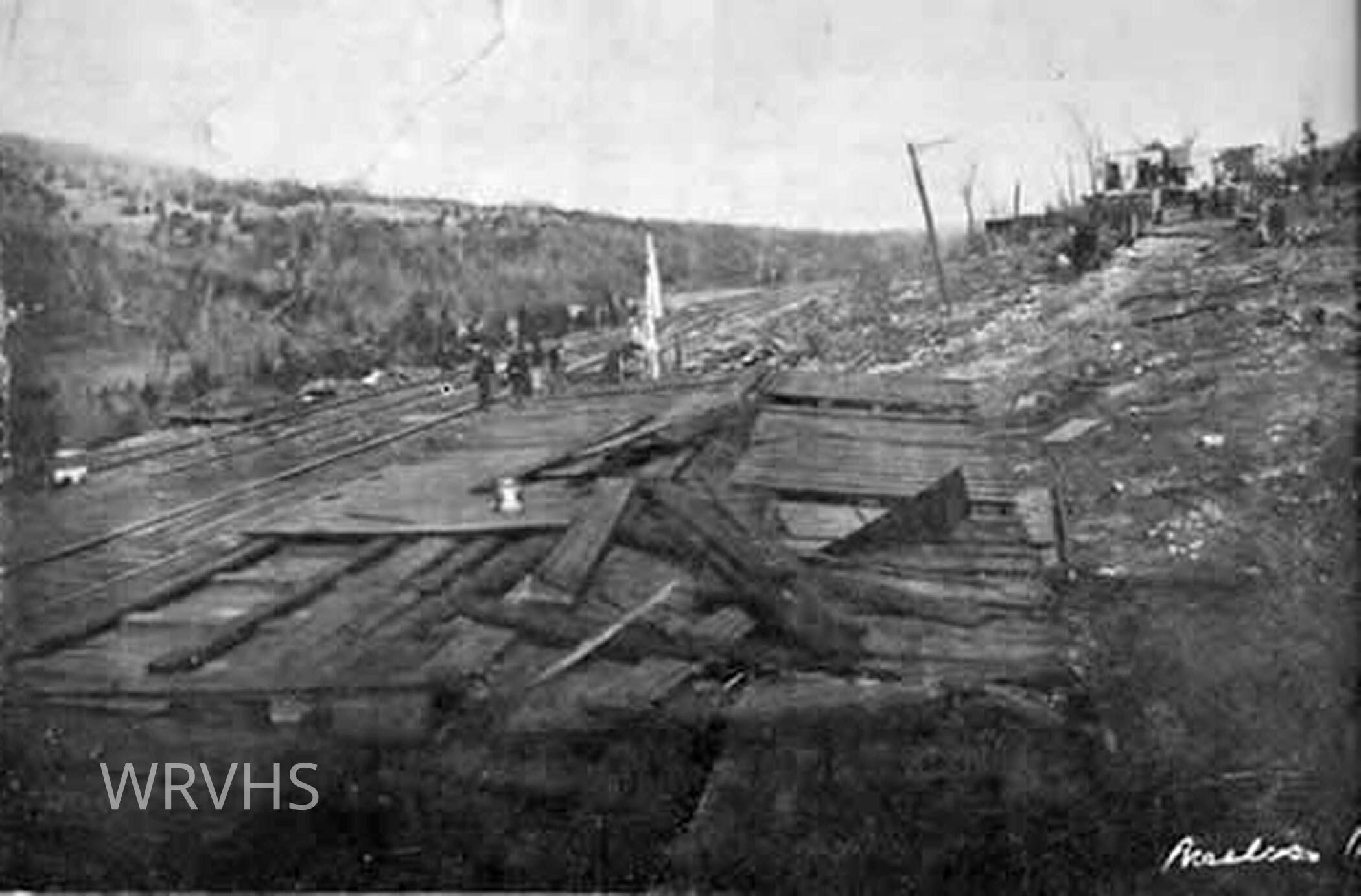 Black and white photo of remains of Melva, Missouri, depot destroyed in the Tornado March 11, 1920; debris of Lucy Woods home in background.Relationships