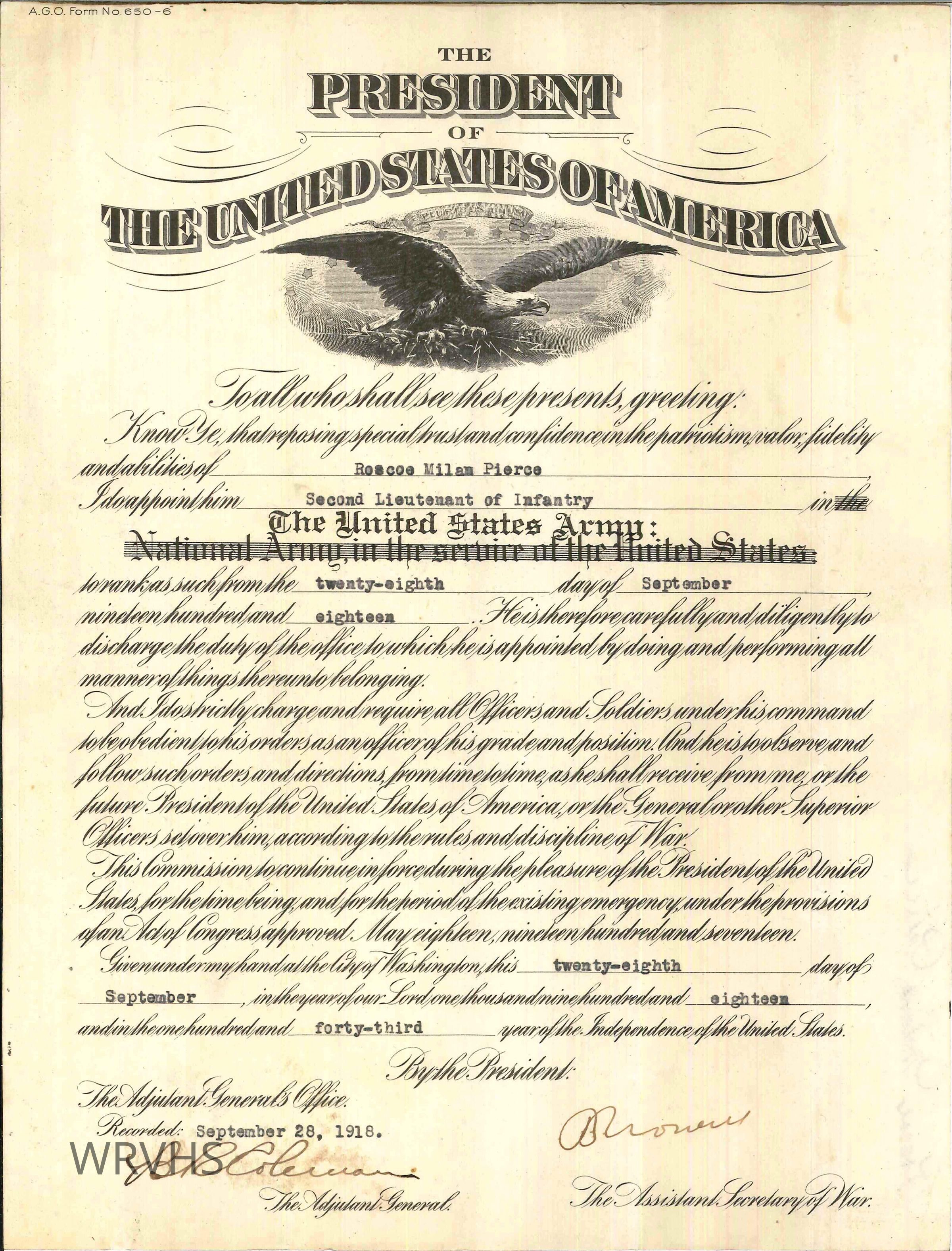 Roscoe Milan Pierce's promotion to Second Lieutenant of Infantry in the United States Army.Relationships