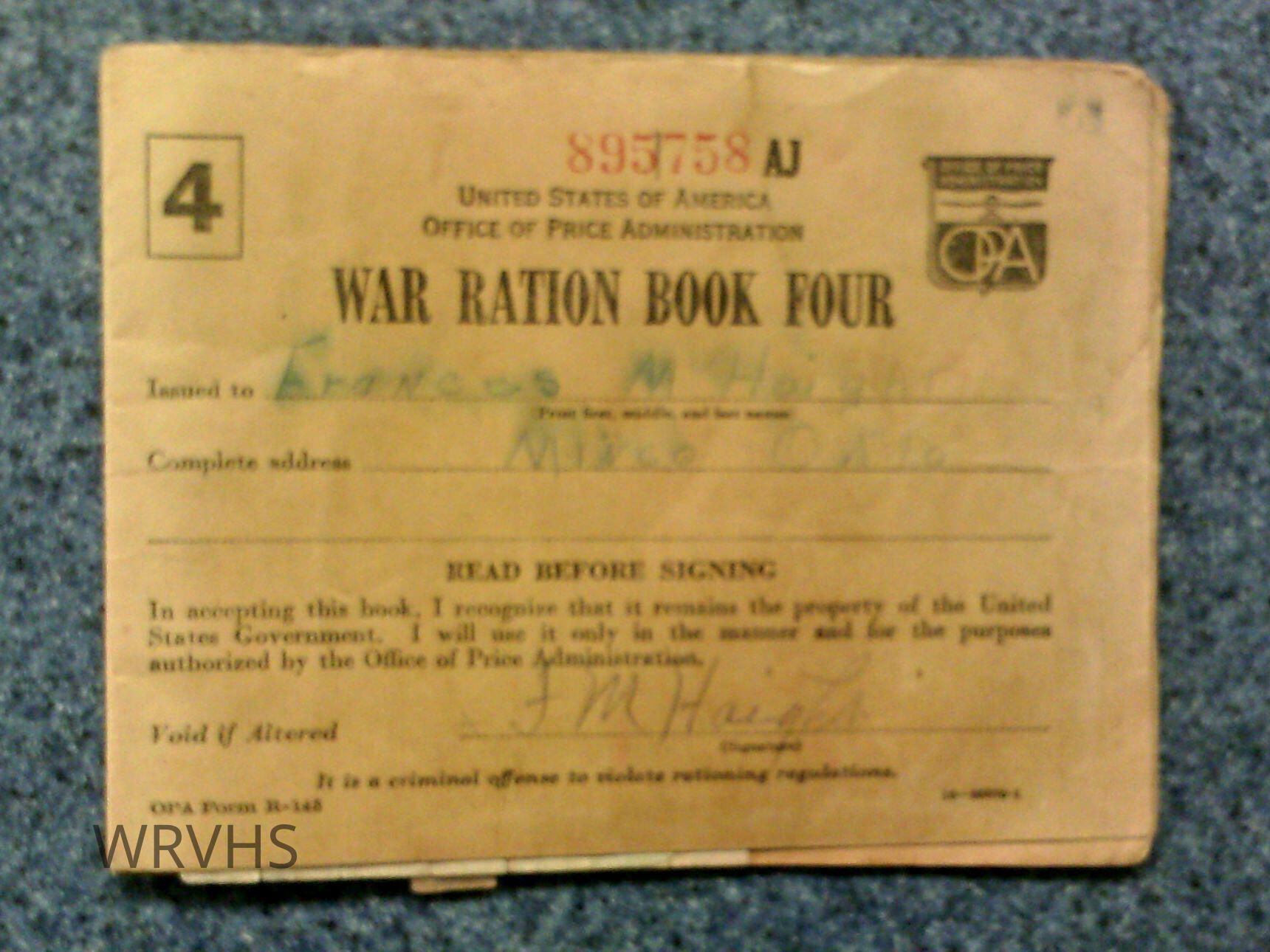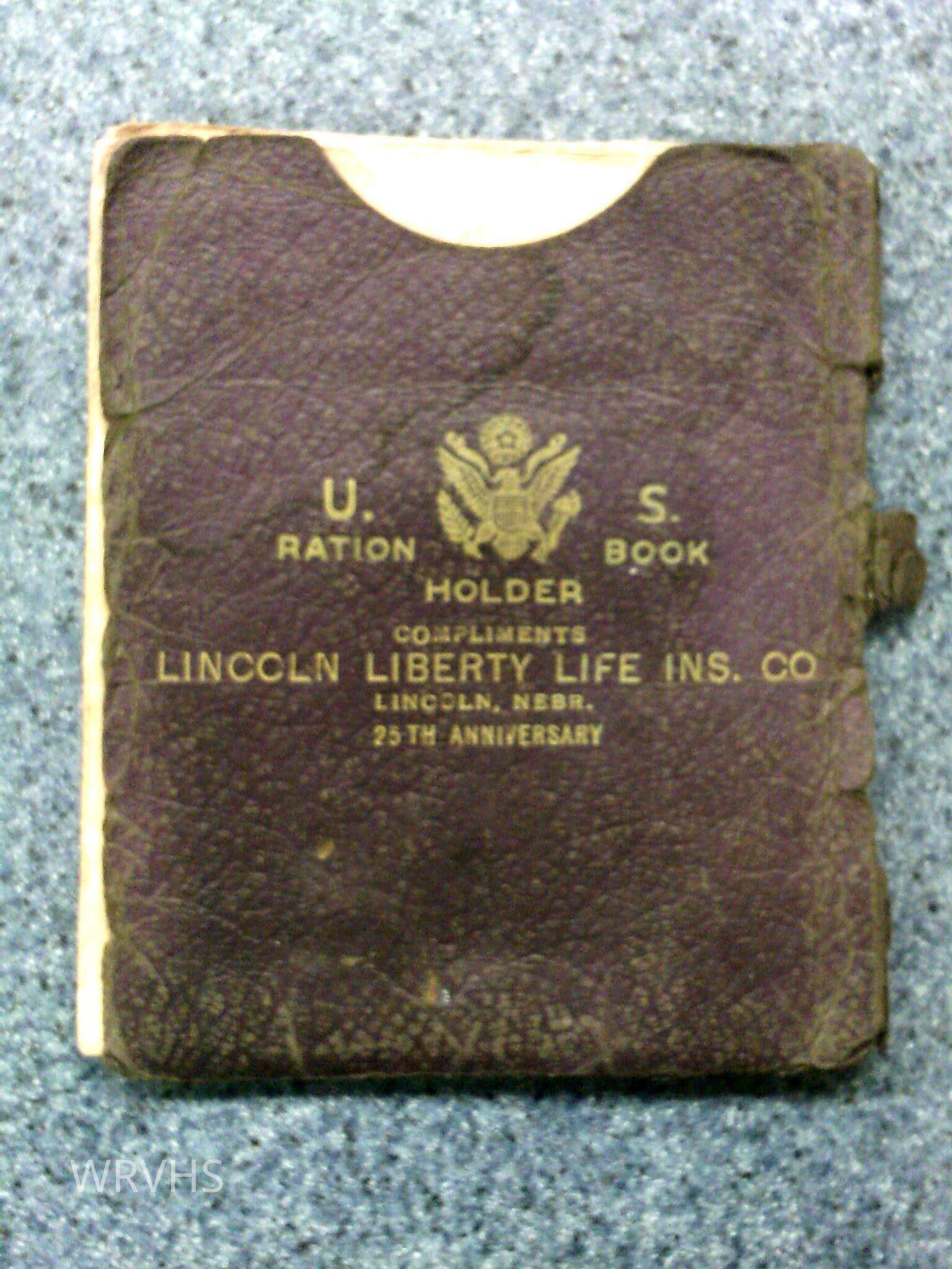 2 war ration books and a ration book holder. One ration book belonged to Frances M. Haight, and one belonged to Winnie A. Haight.