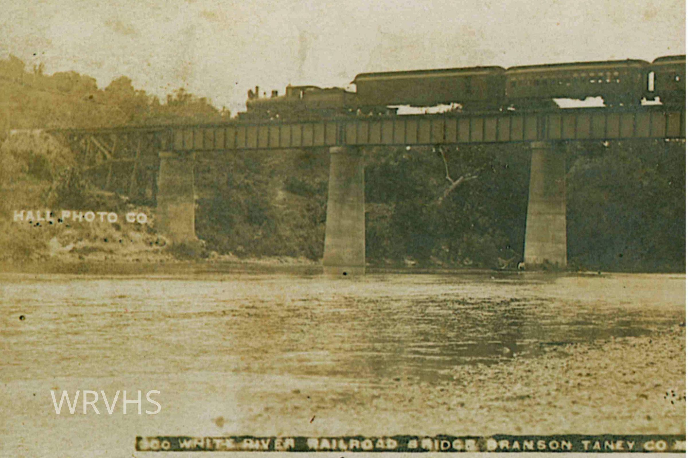 Black and white photo of a train on the Missouri Pacific Railway bridge over White River near Hollister, Missouri.