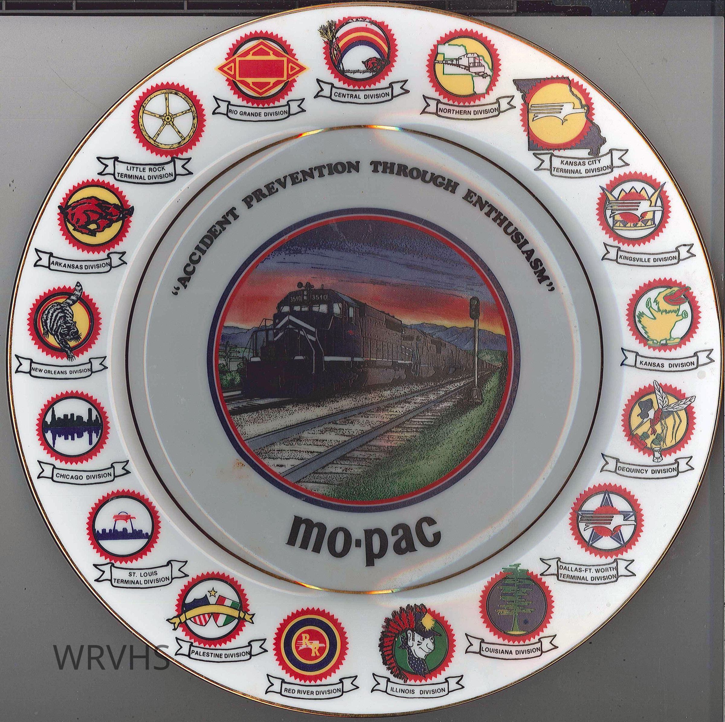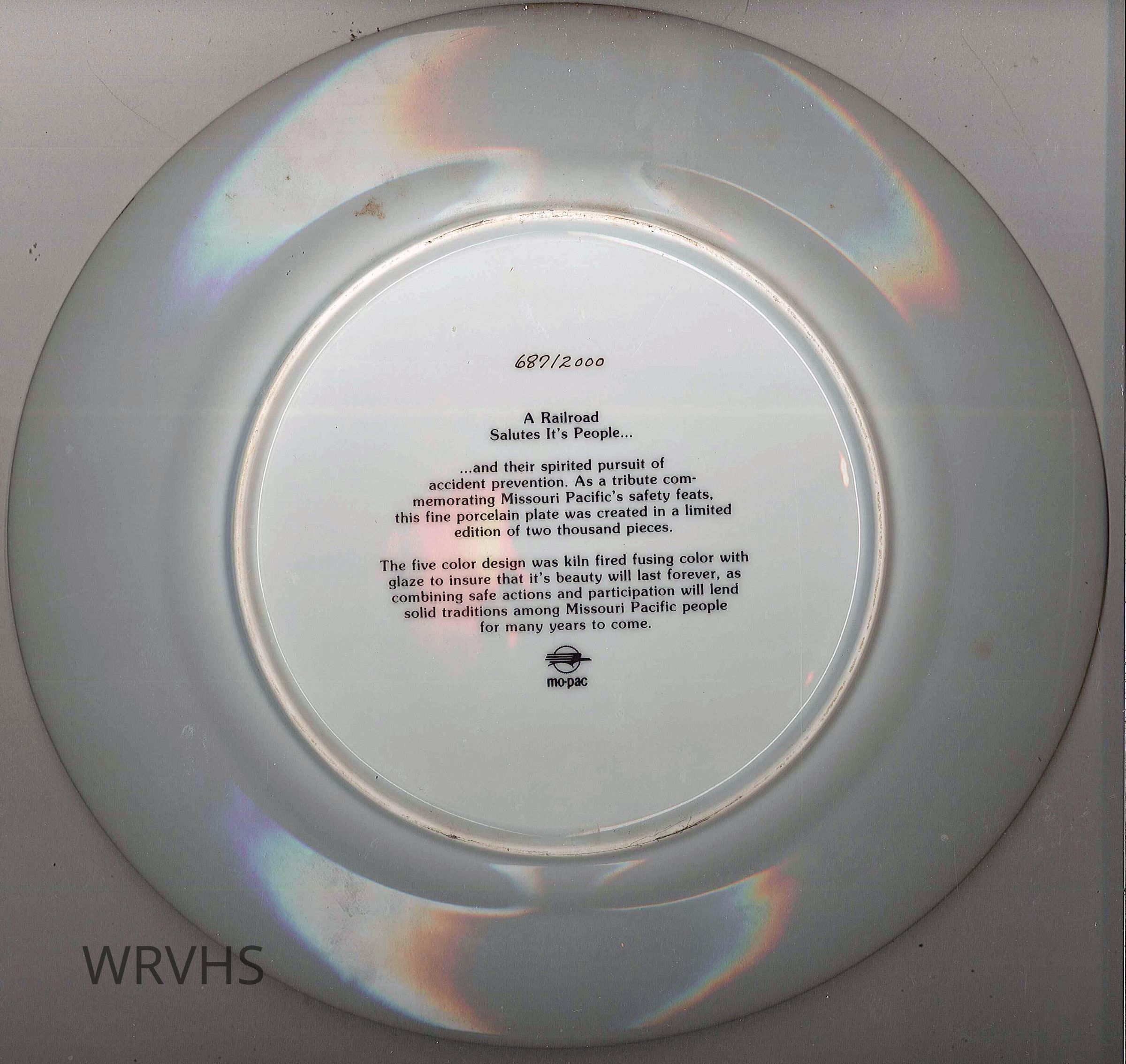 Commemorative plate: "A railroad salutes it's [sic] people ... and their spirited pursuit of accident prevention. As a tribute commemorating Missouri Pacific's safety feats, this fine porcelain plate was created in a limited edition of two thousand pieces
