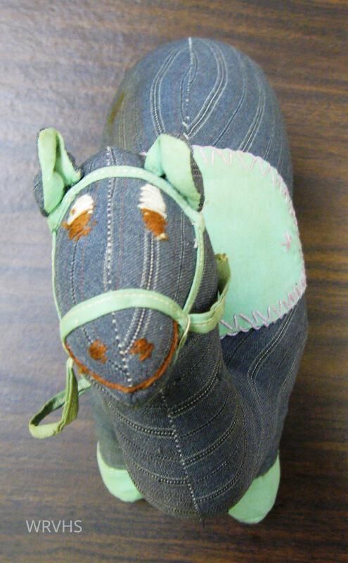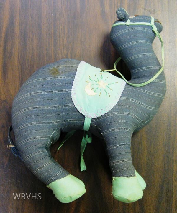 Homemade stuffed animal, camel. Body made of blue material with thin white stripes. Hooves, saddle and bridle are light green. Face is embroidered. Some sort of metal decoration is pinned to the saddle.Relationships