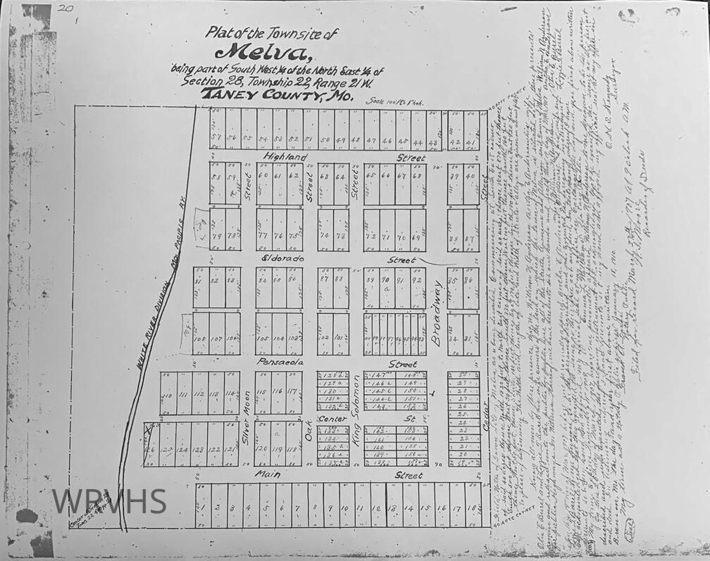 Plat of the townsite of Melva, being a part of south west 1/4 of the north easdt 1/4 of section 28, township 22, range 21 w. Taney County, Mo.