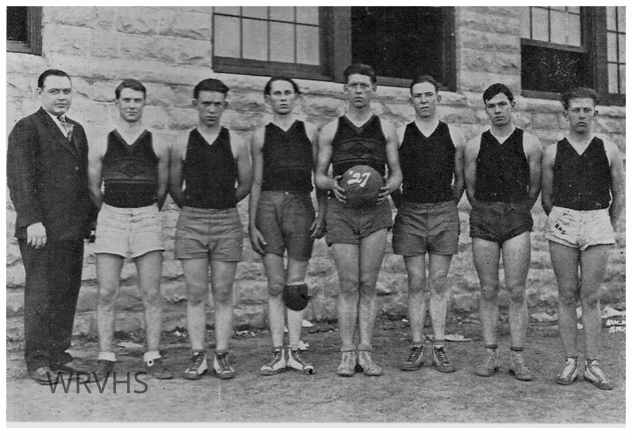 Black and white photo of Branson High School boys basketball team, 1927; Superintendant L. C. Duff in center, back row.Relationships
