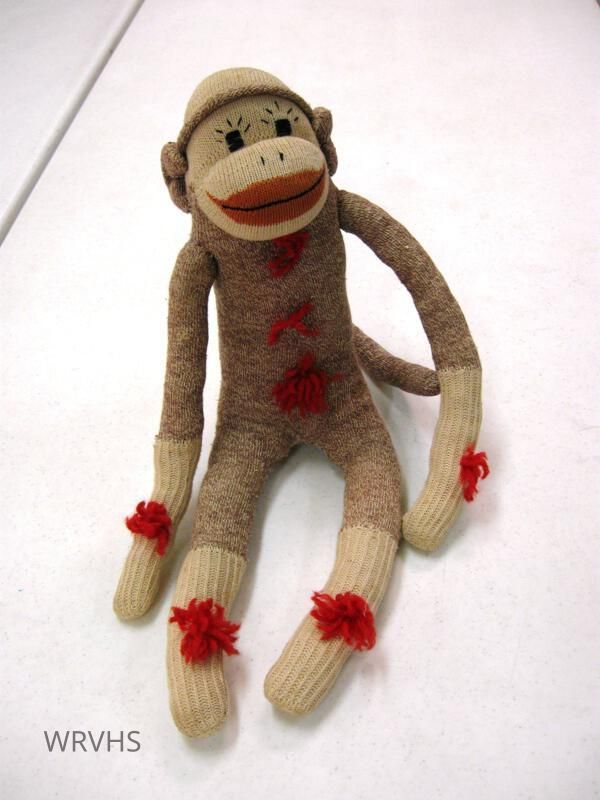 1 sock monkey made by Polly Owings Iott. Predominately brown. Has 3 tufts of red yarn on the chest and 1 tuft on each arm and leg. Hat has no ornamentation.Relationships