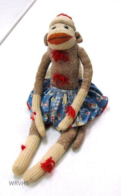 1 sock monkey made by Polly Owings Iott. Predominately brown. Wearing a blue skirt with fruit on it. Has 2 tufts of red yarn on the chest, 1 tuft on each arm and leg, and 1 tuft on the hat.Relationships