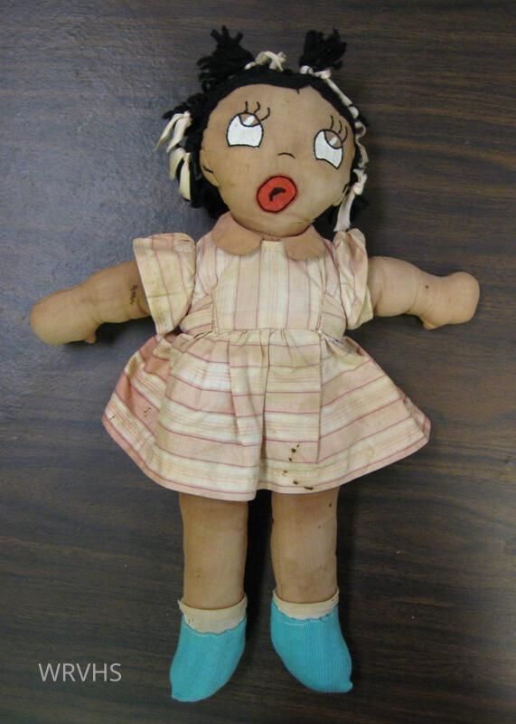 Homemade female doll. Wearing a rose colored striped dress (faded) with shorts (not faded) and blue cloth shoes. Hair is in many pig tails. Face is embroidered and painted. There is a stain on the bottom front of the dress.