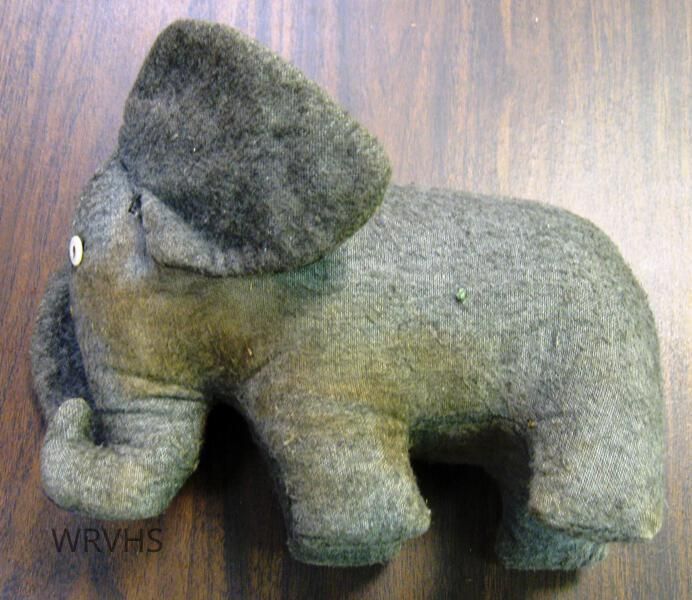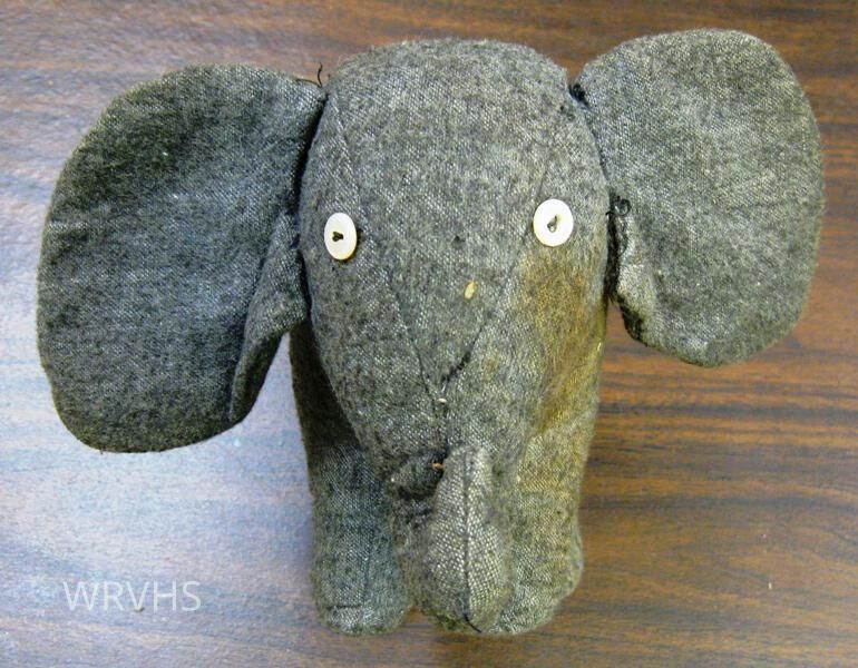 Homemade stuffed animal, elephant. Made of gray material with button eyes. Brown stain on the left side of the body.Relationships
