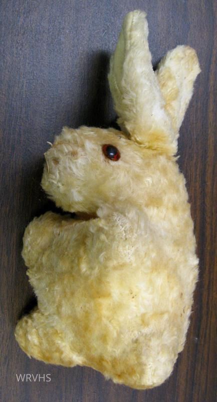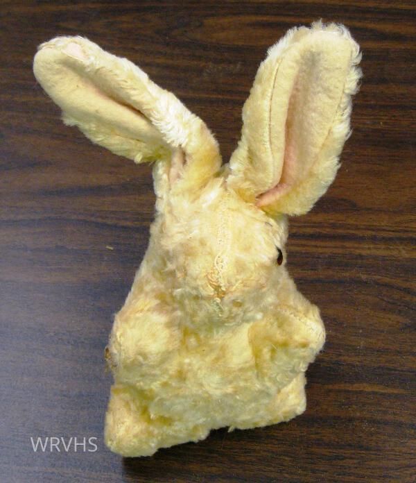 Stuffed animal, bunny. Gold colored fur. Bell inside the tail. Eye is missing on its right side.Relationships