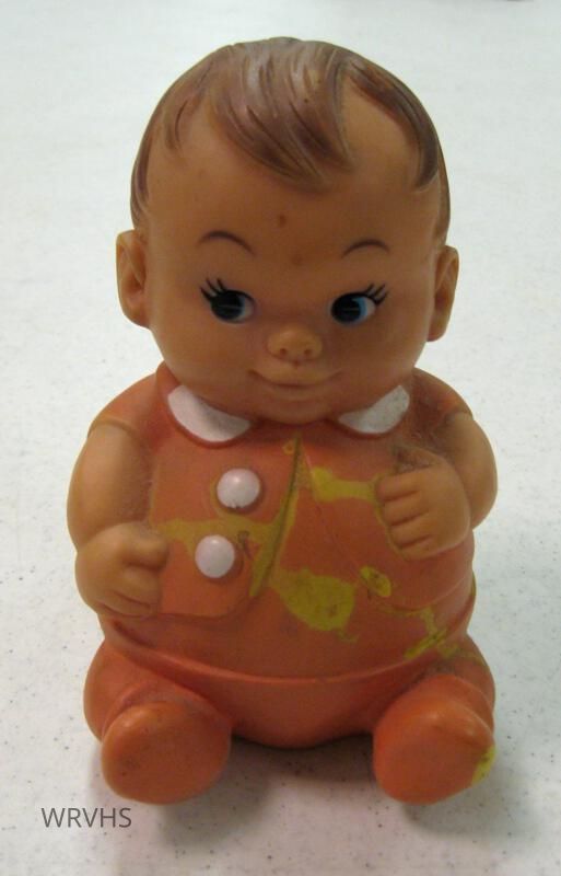 1 plastic/rubber baby doll. Doll is wearing an orange outfit with a white collar and buttons.