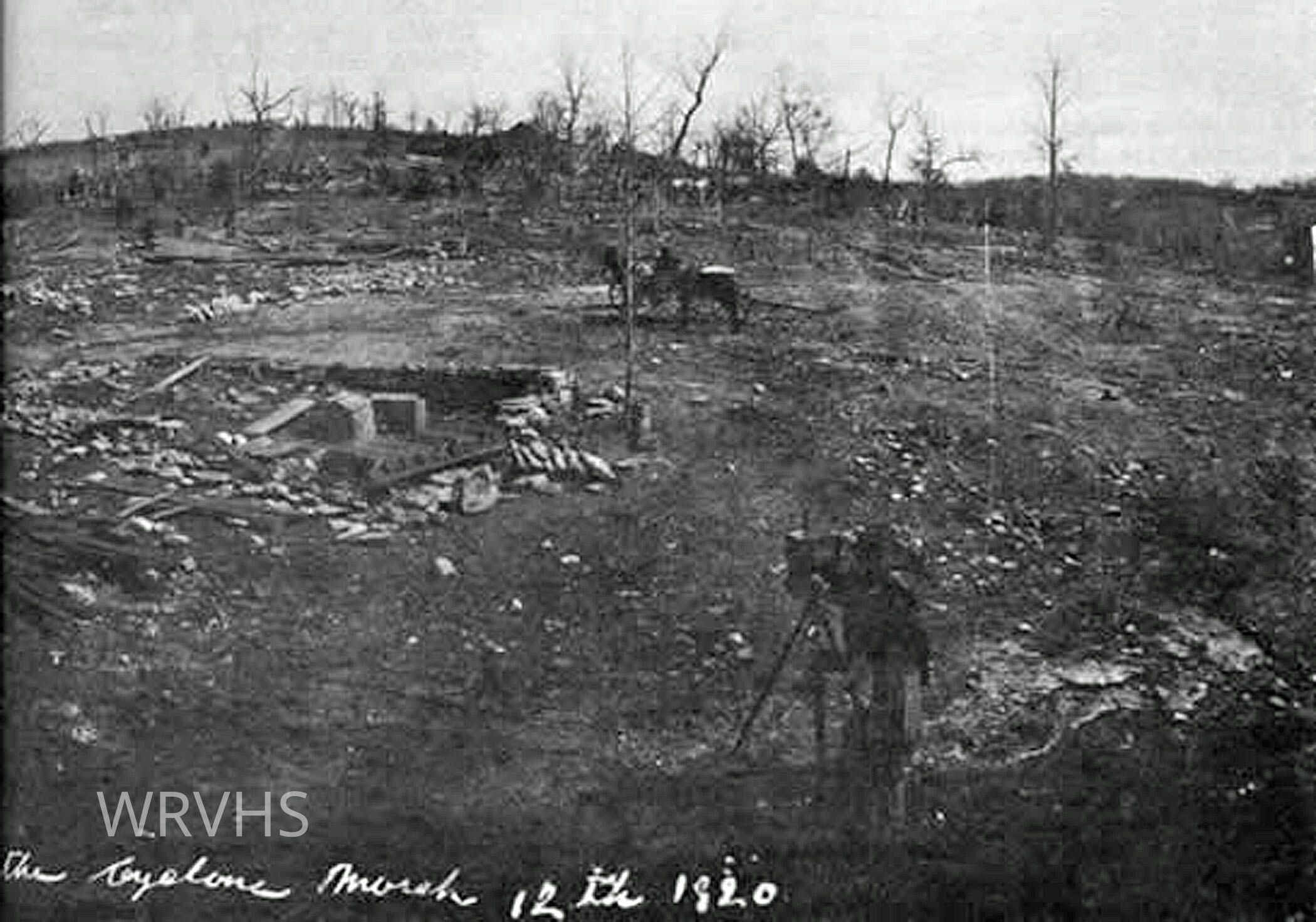 Black and white photo of site of Melva, Missouri, following tornado, March 11, 1920; photographer in foreground.