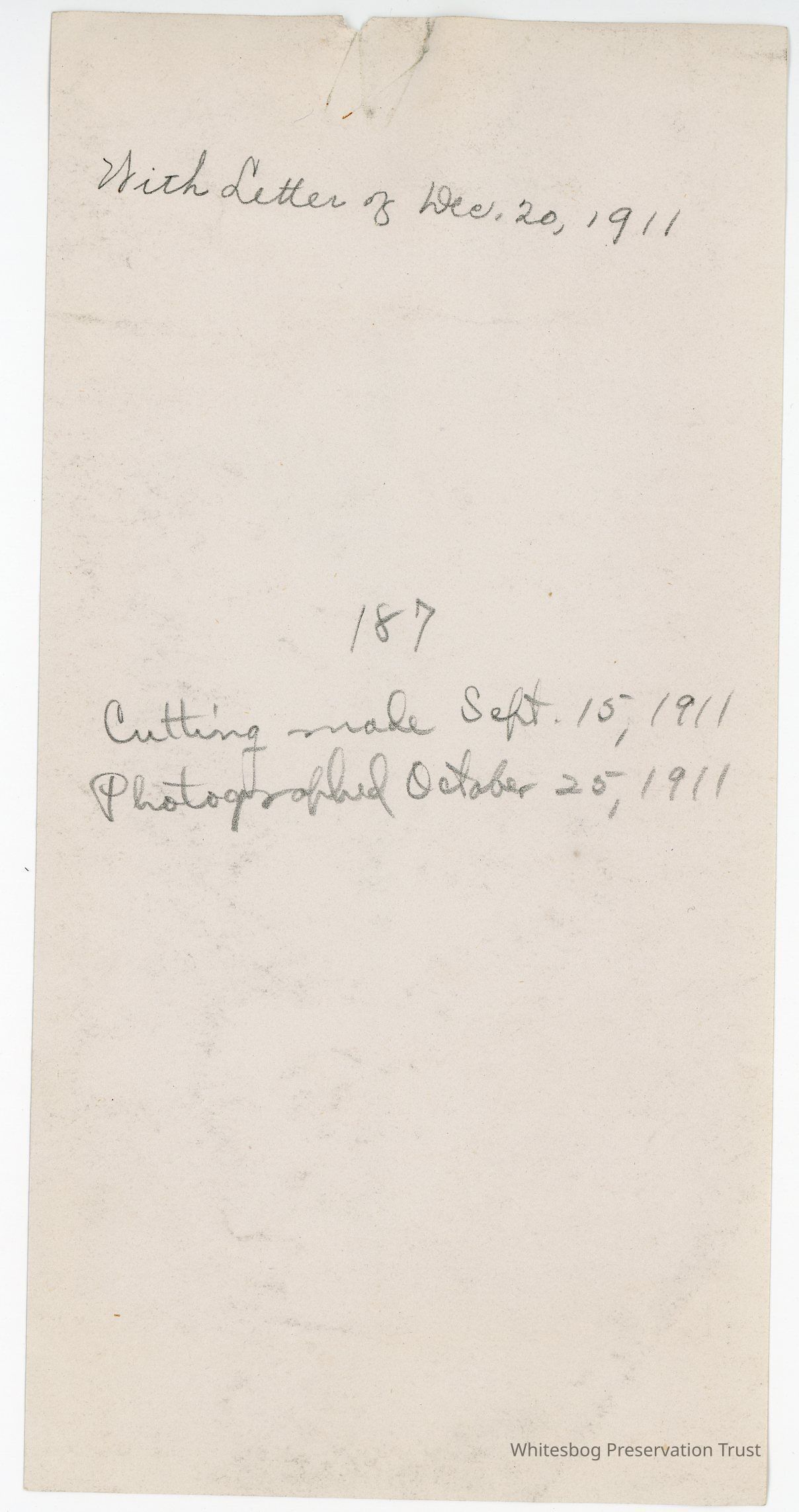 10/25/1911 "Cutting made Sept. 15, 1911 ... With letter Dec 20, 1911."