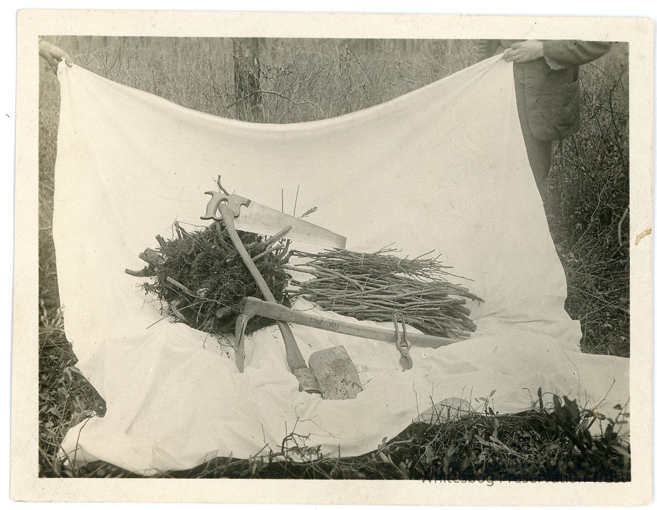11/1916 Collection of branches and saws on a sheet, held up by 2 unknown people.