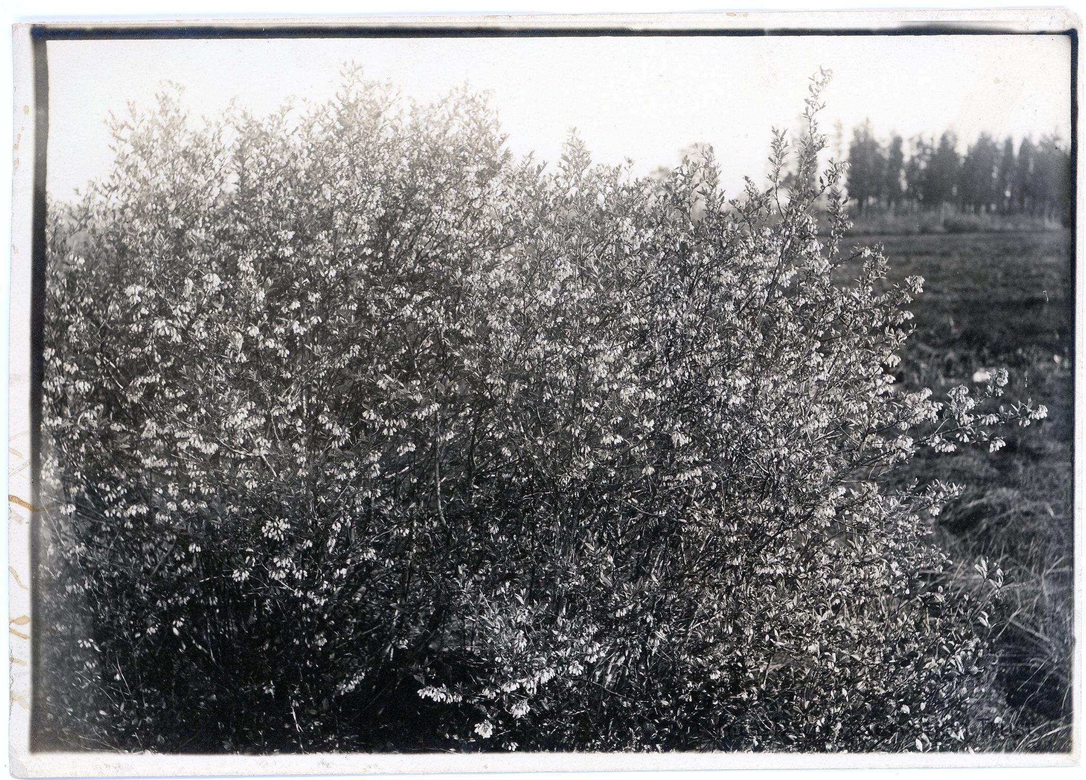 Photograph from May 18th, 1914. It is black and white and depicts a wild blueberry bush, the background a lush field and with a splattering of tall pine trees blurry in the distance. The back has cursive writing.