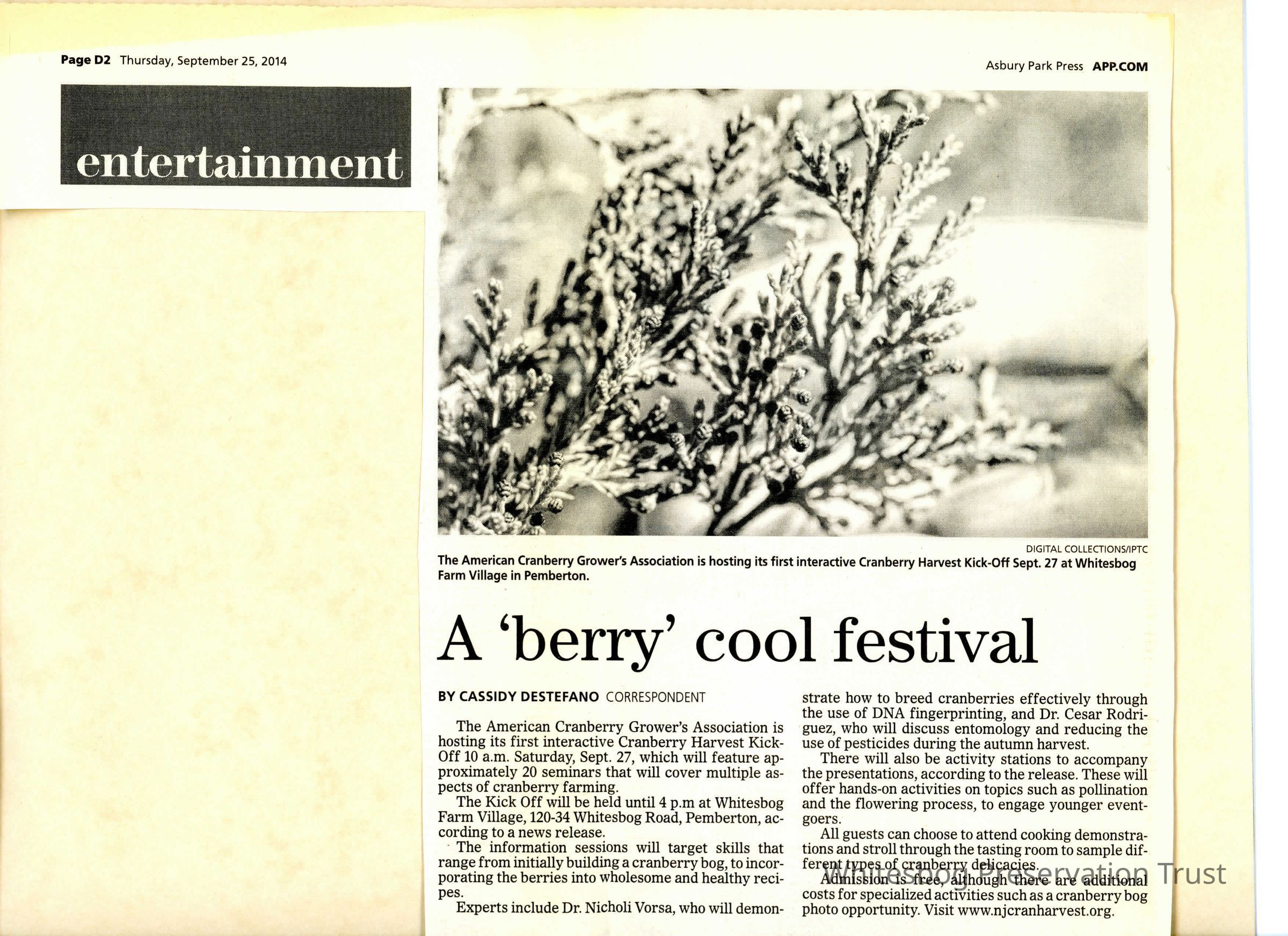 An article about the American Cranberry Growers Association's first interactive cranberry harvest kickoff to be held at Whitesbog on Saturday, September 27th.