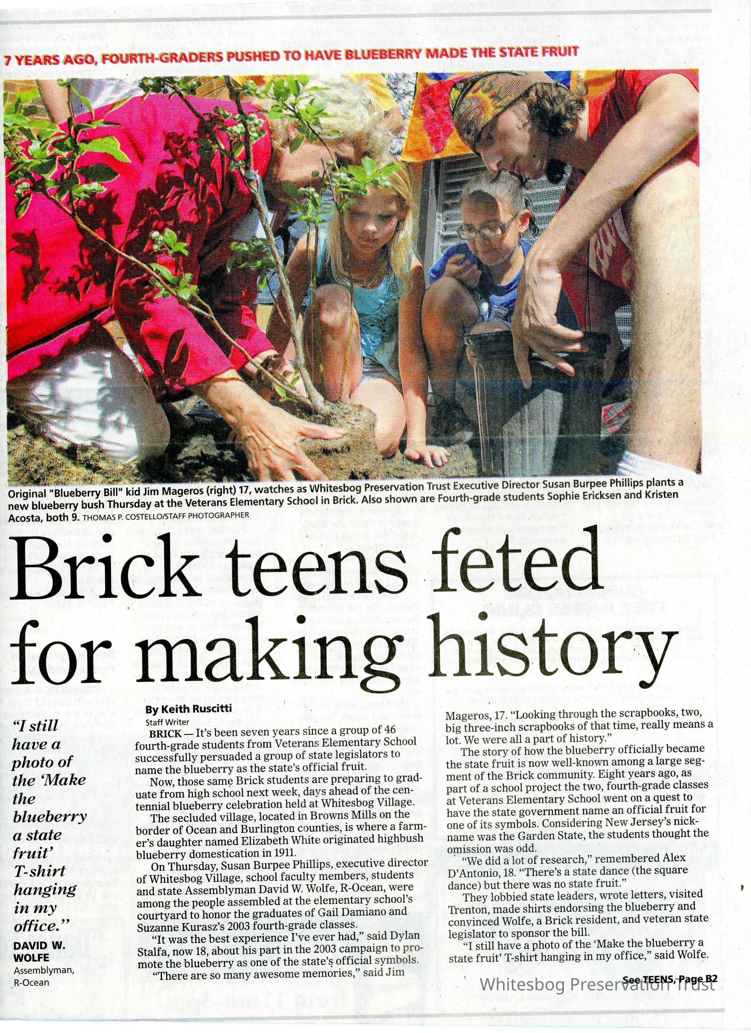 An article about the 4th grade class from Veterans Memorial Elementary School, now teenagers, who inspired the bill that made the blueberry the state fruit of New Jersey.