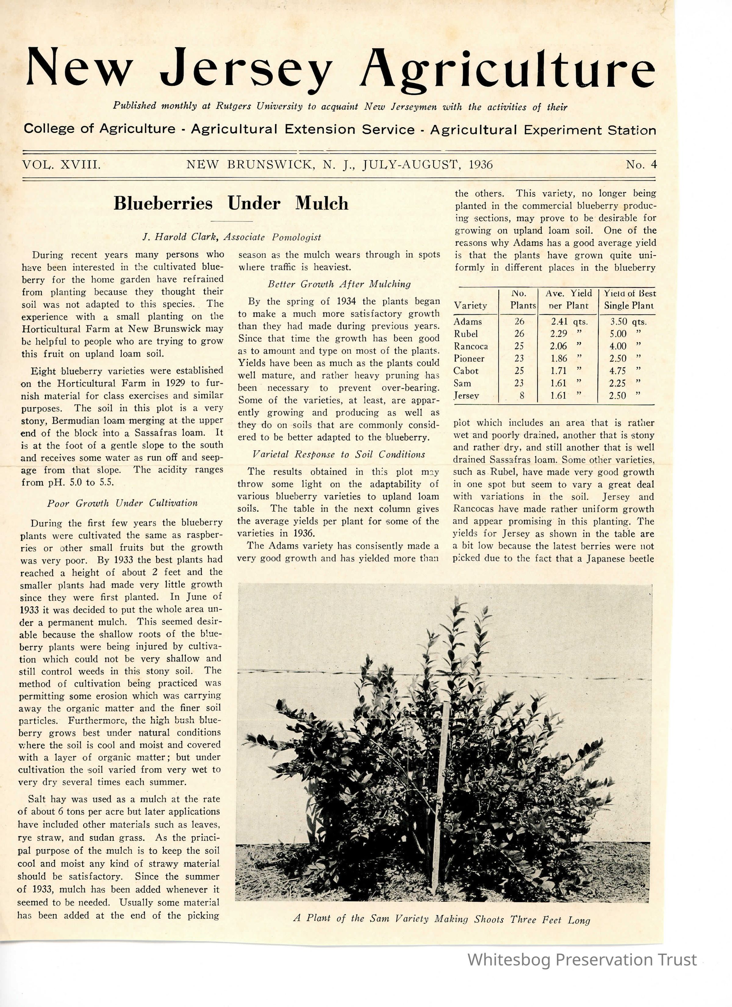 Summary: The article was published by the Agricultural Experiment Station of Rutgers. The author discusses the difficulties of raising blueberries in a garden setting with a loam soil base. He then shows via graphs how growth is improved after mulching. The reader should remember that these observations and recommendations were made in 1936. Agricultural methodology may have changed.Collection