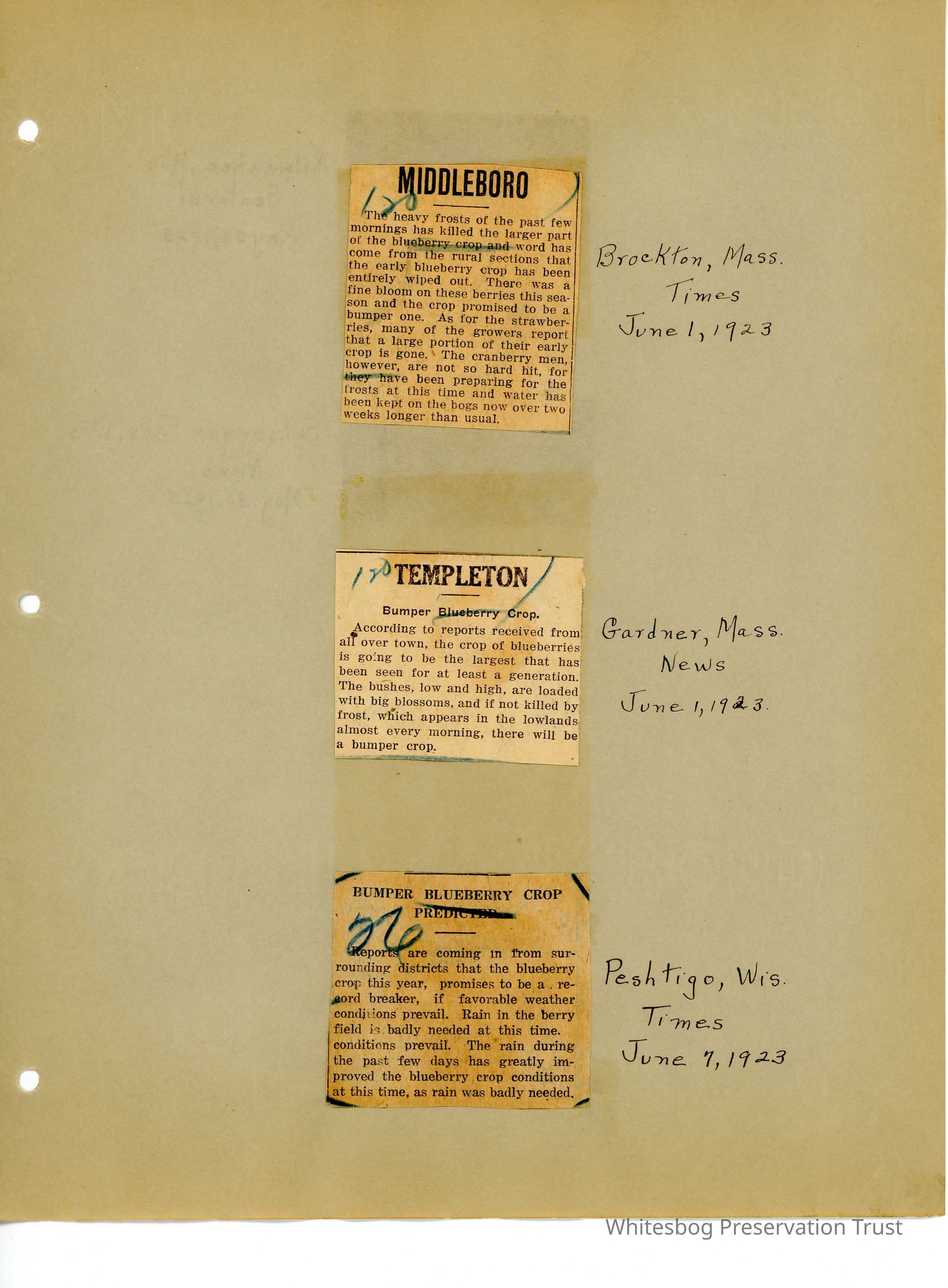 Predictions of the size of the blueberry crops in 1923 by specific area. Factors such as frost destroyed the crop in some locales while other areas appeared to be in store for a bumper crop.