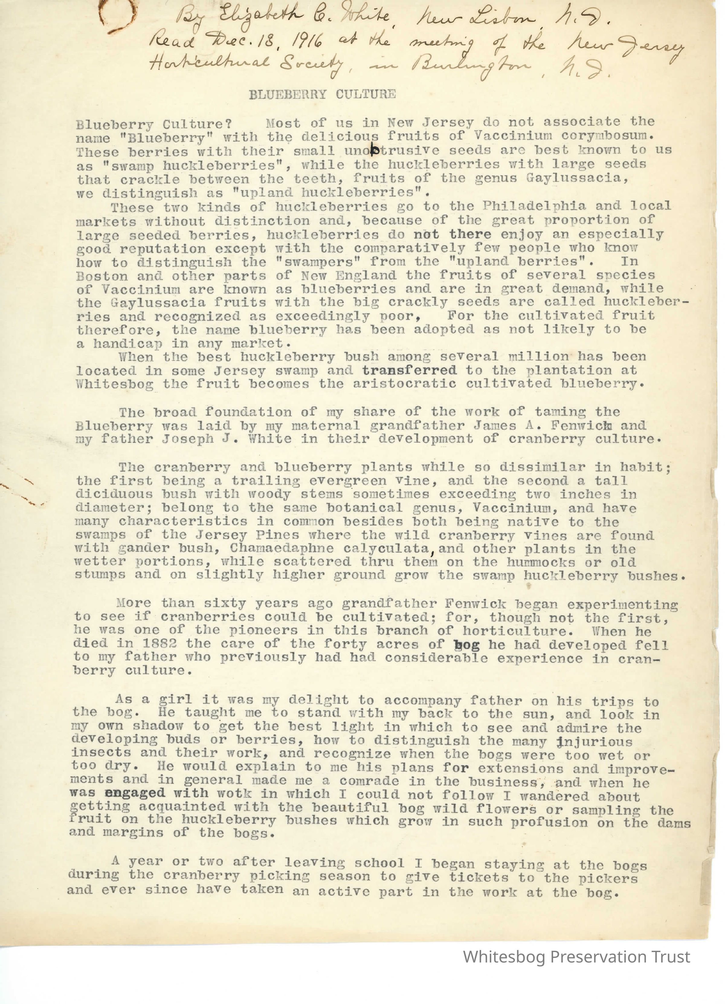 Credit success with blueberries to the foundation laid by Grandfather James A. Fenwick and father Joseph J. White in their development of cranberry culture. History of the work done between 1911 and 1916 including lessons learned about irrigation, fertilization and propagation. Human interest story in the selling of the 1916 crop of 17 crates to Hudson River Day Line.Collection