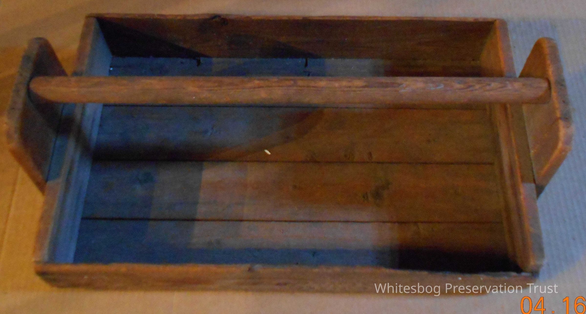 Home-made box used by pickers in the field. It holds eight quart containers and has a handle in the center, running the length of the box. 23" L x 13-1/2" W x 8" H with handle x 3-1/2" Deep