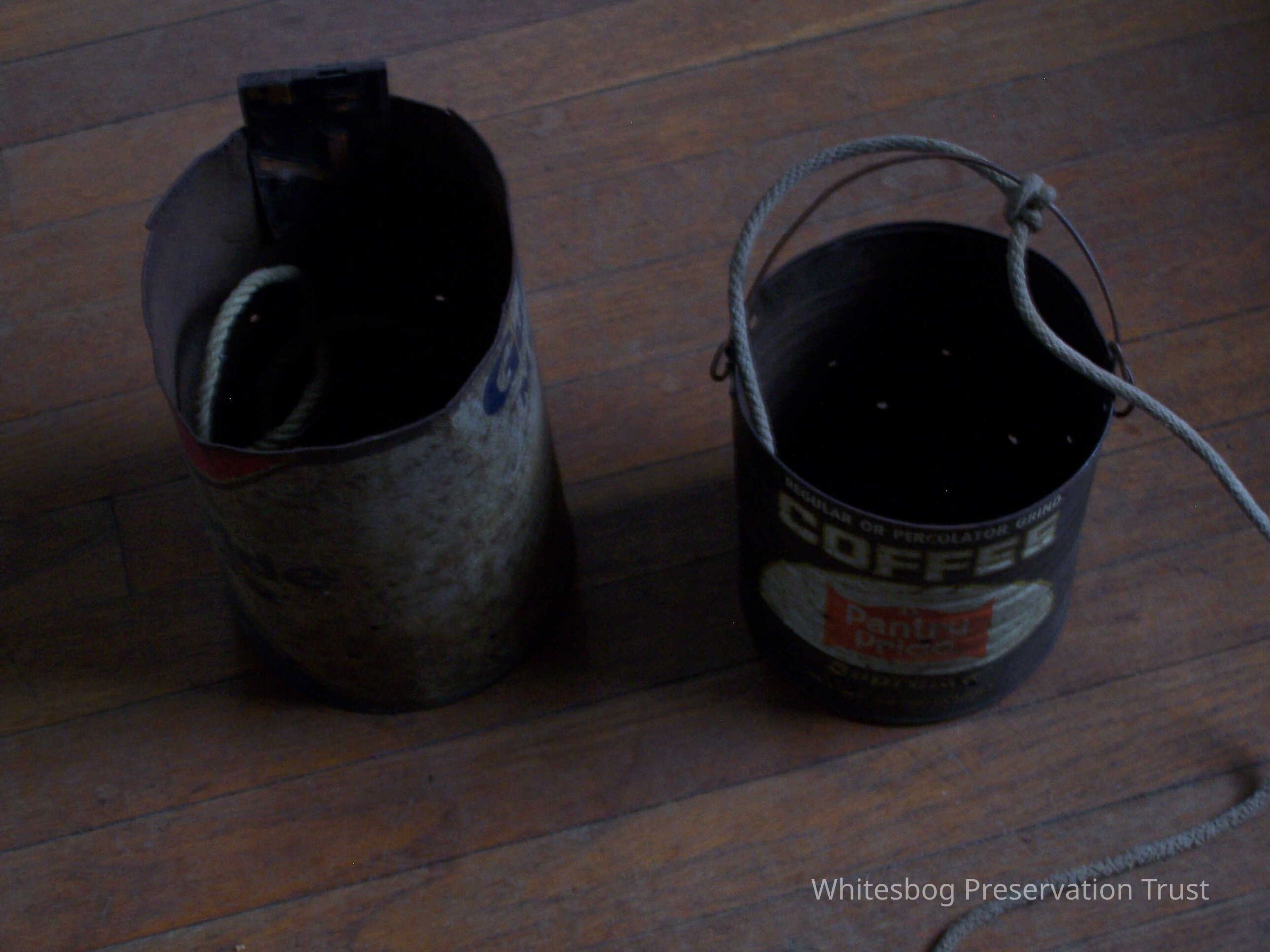 Any type of can that could be tied around the waist; e.g., used large canned food containers that have holes bored on each side and a rope or a similar material placed through the holes to tie. There are two examples of this article