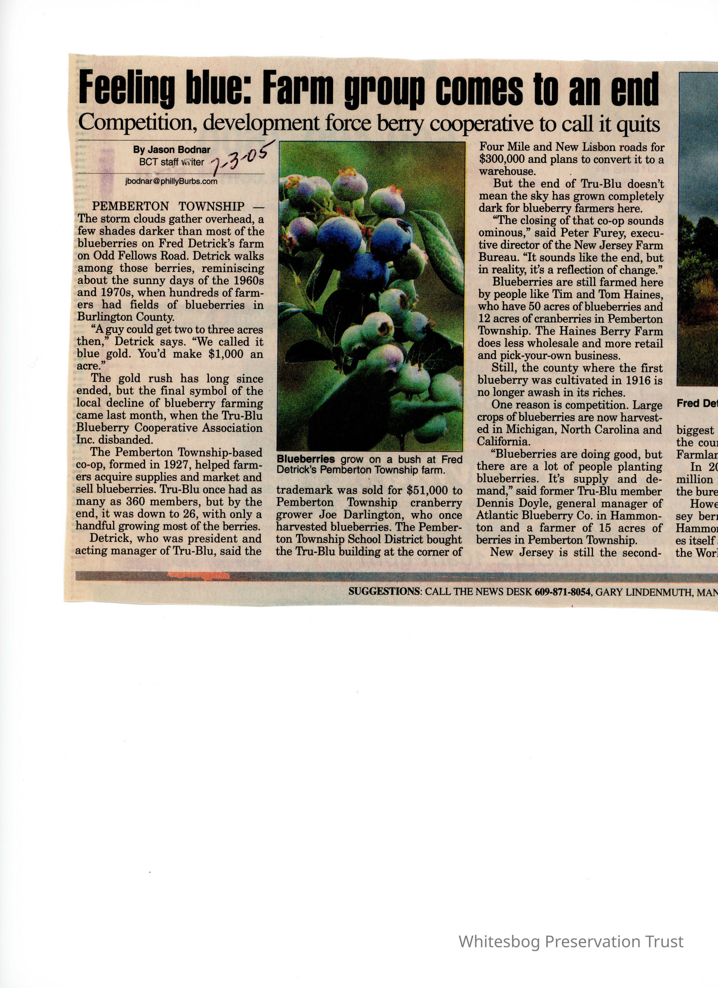 An article about the Tru-Blu Blueberry Cooperative Association coming to an end. The article also mentions that the growing of blueberries has gone down in Burlington County due to competition from out of state and Hammonton.