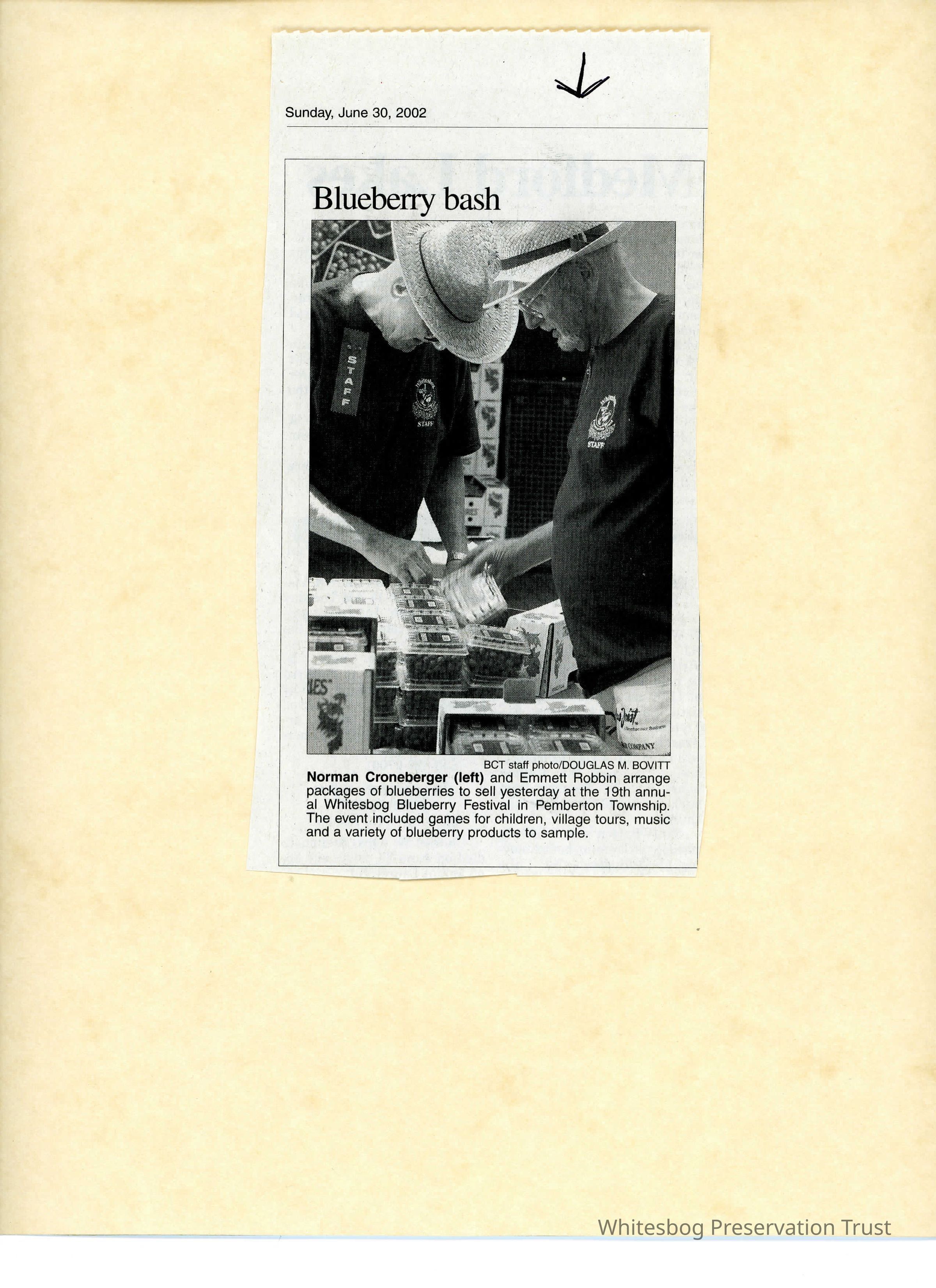 This is a picture featuring Norman Croneberger and Emmett Robbin at the 2002 blueberry festival. An arrow pointing down was found drawn at the top.